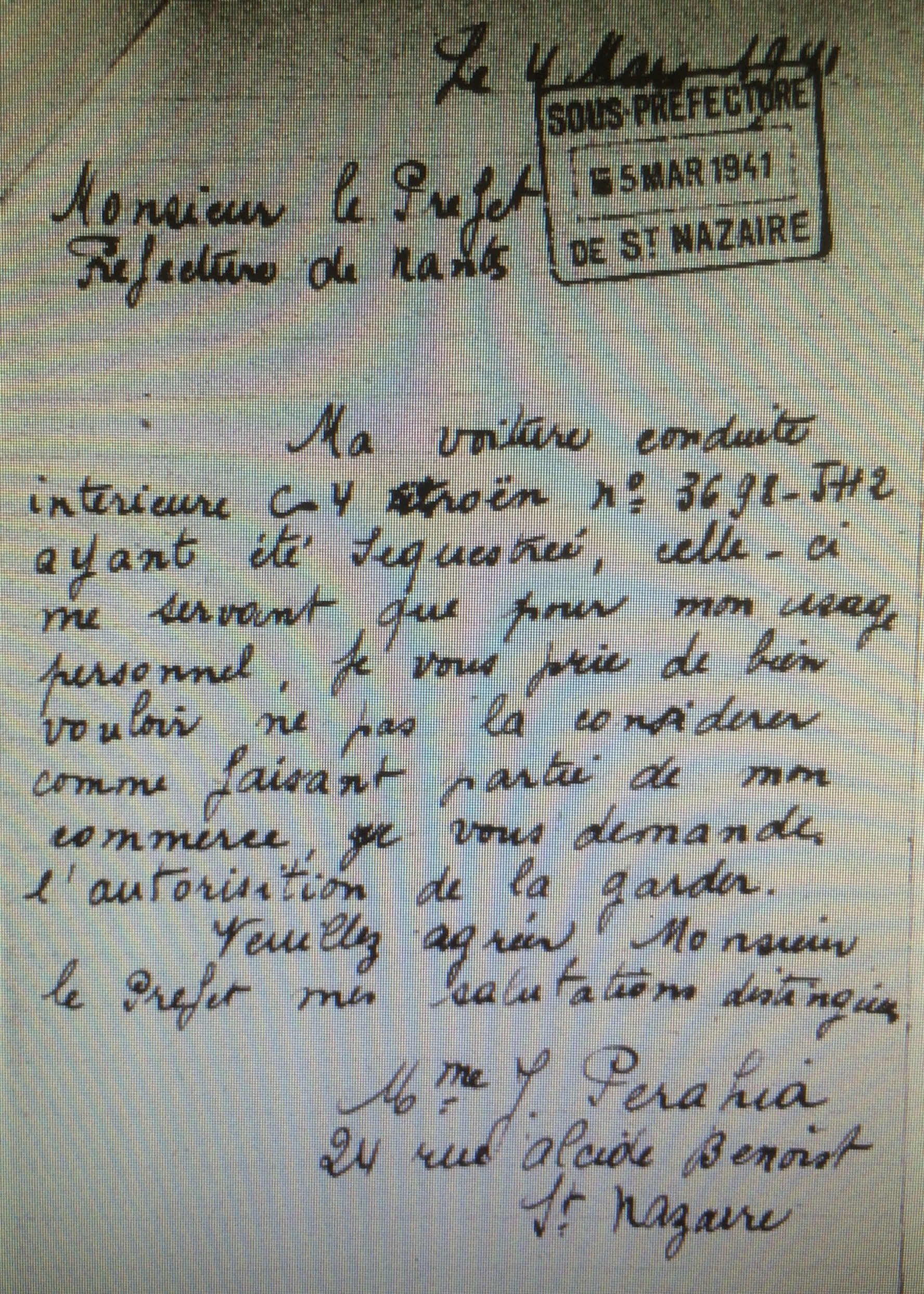 Gabriel HERVOUËT, l’administrateur provisoire chargé de la vente du commerce, nommé par le sous-préfet en janvier 1942, n’avait pas manqué, dans le zèle qui le caractérise, d’englober dans l’actif de l’entreprise la dite voiture. Jeanne PERAHIA écrit donc au préfet pour tenter de la récupérer, ce qu’elle obtiendra.