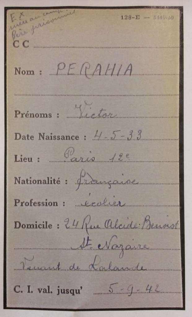 Fiches d’internement de Victor PERAHIA Camp de Drancy [Archives Nationales F9/5746]