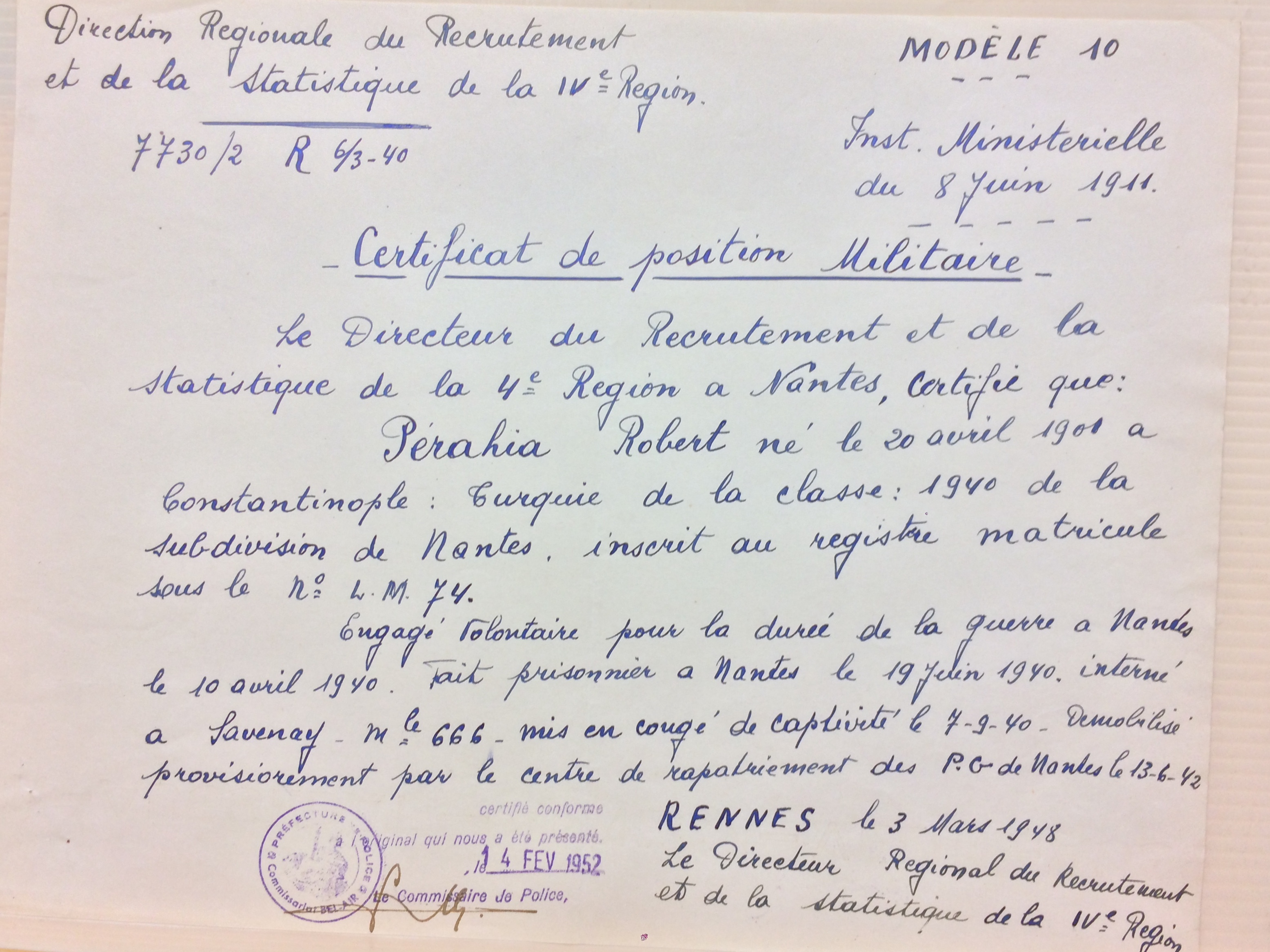 Robert PERAHIA se rend à Nantes entre le 29 février et le 02 mars 1940 pour un éventuel engagement et s’engage volontairement le 10 avril 1940 à Nantes. Il est affecté au Dépôt du Train n°11 à Nantes. Il est fait prisonnier dans cette même ville le 19 juin 1940 puis est interné pendant près de trois mois en temps que prisonnier de guerre (matricule 666) à Savenay. En raison de sa nationalité turque, il n’est pas envoyé en stalag mais est libéré et mis en congé de captivité le 07 septembre 1940. Il sera démobilisé le 13 juin 1942.