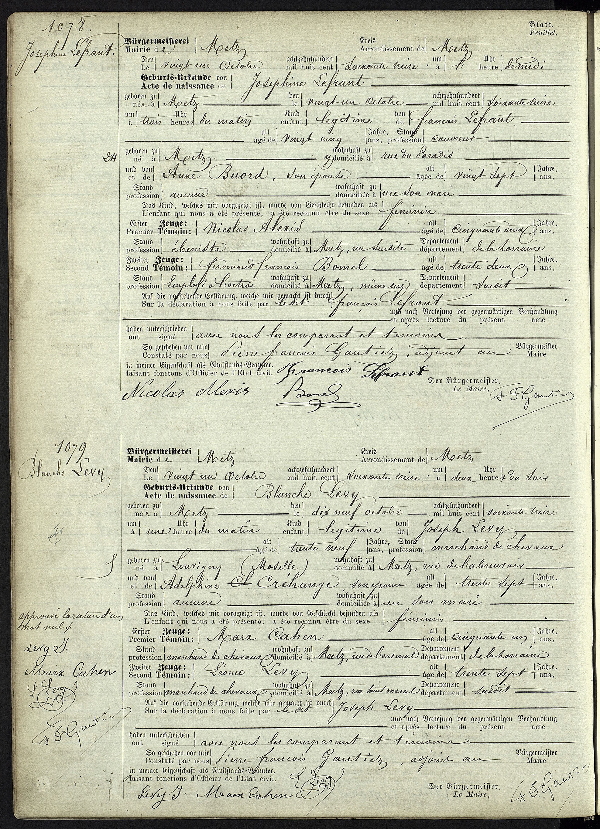 Blanche LEVY est née le 19 juin 1873 à Metz (Moselle) [Père : Joseph LEVY né à Louvigny, marchand de chevaux et Mère : Delphine CREHANGE né à Saint-Mihiel (Meuse)]. Elle est célibataire.