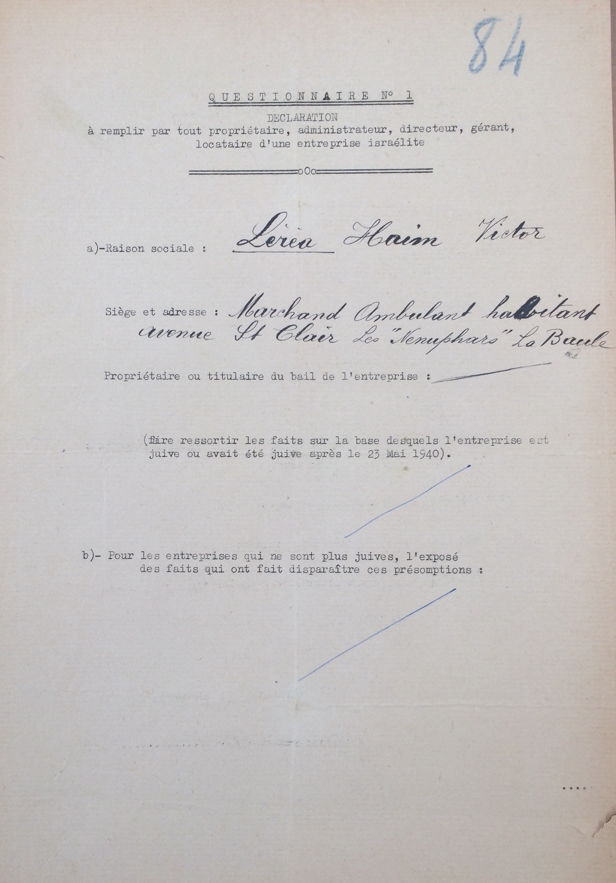 Entre le 27 septembre et le 20 octobre 1940, Victor se fait recenser auprès de la sous-préfecture de Saint-Nazaire sous le numéro 130. Il réside au moment de son arrivée Villa Massabielle esplanade du Casino puis Villa Mirador, passage Beausite au 15 septembre 1939 puis avenue Saint-Clair, Villa « Les Nénuphars » en octobre 1940 . Behora LEREA née AGRANTI recensée juste après, sa mère, habite également avec la famille.