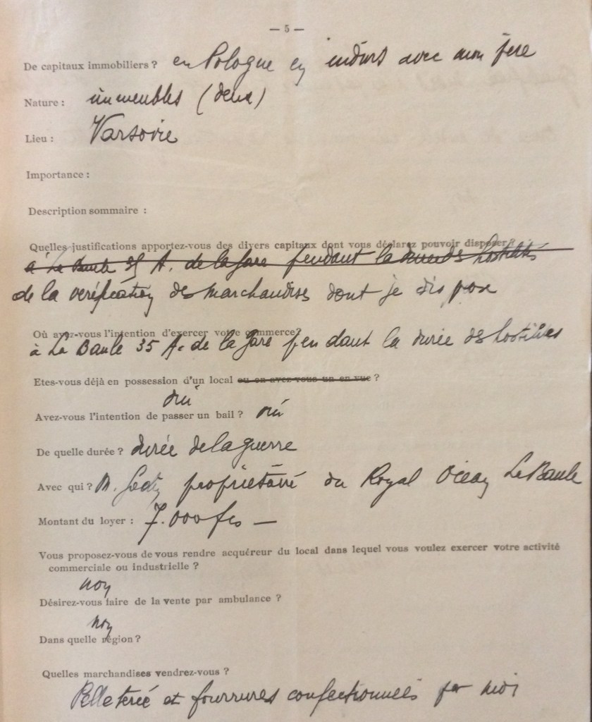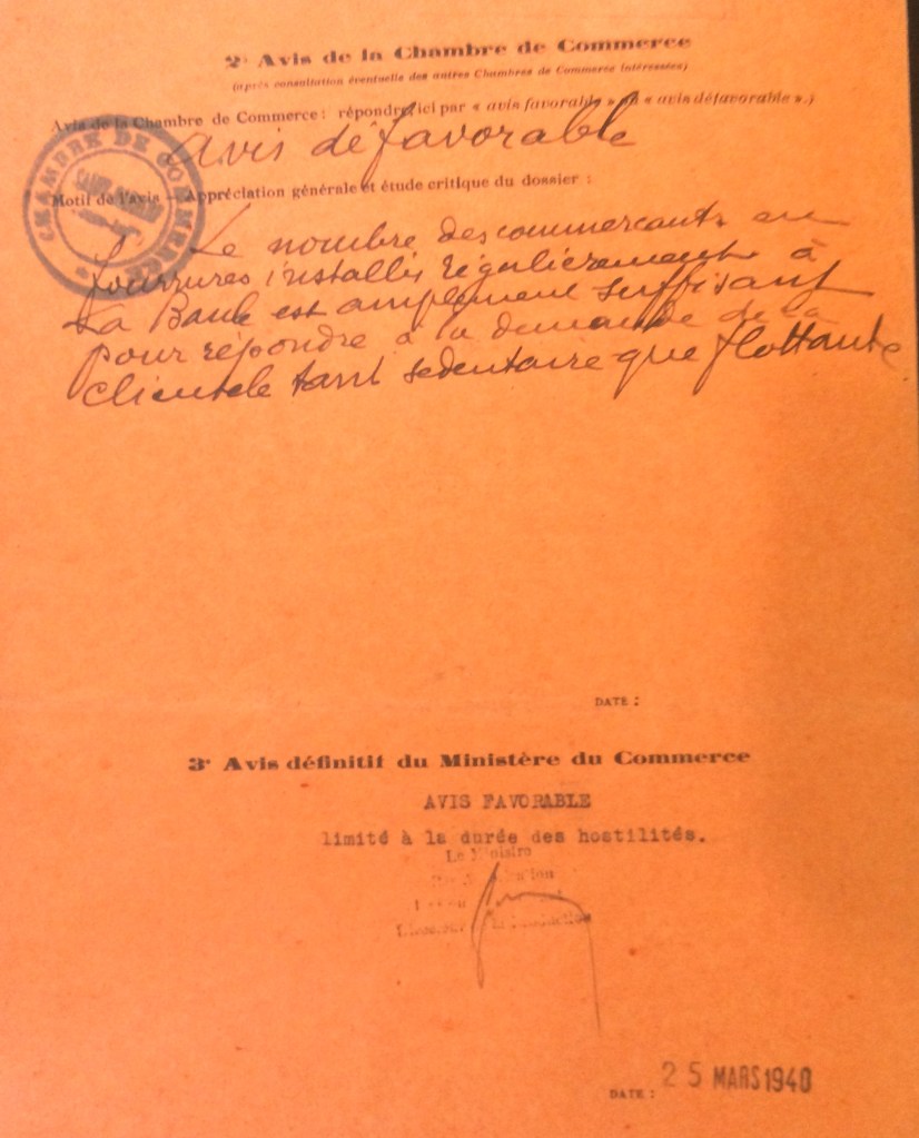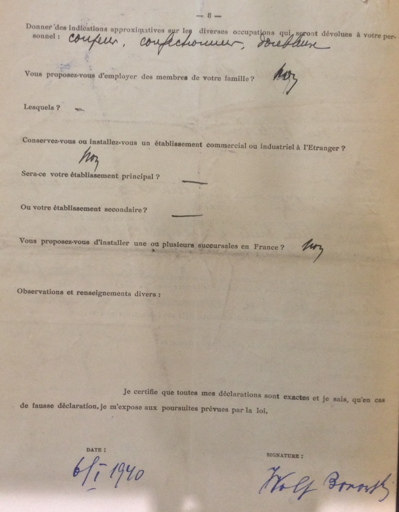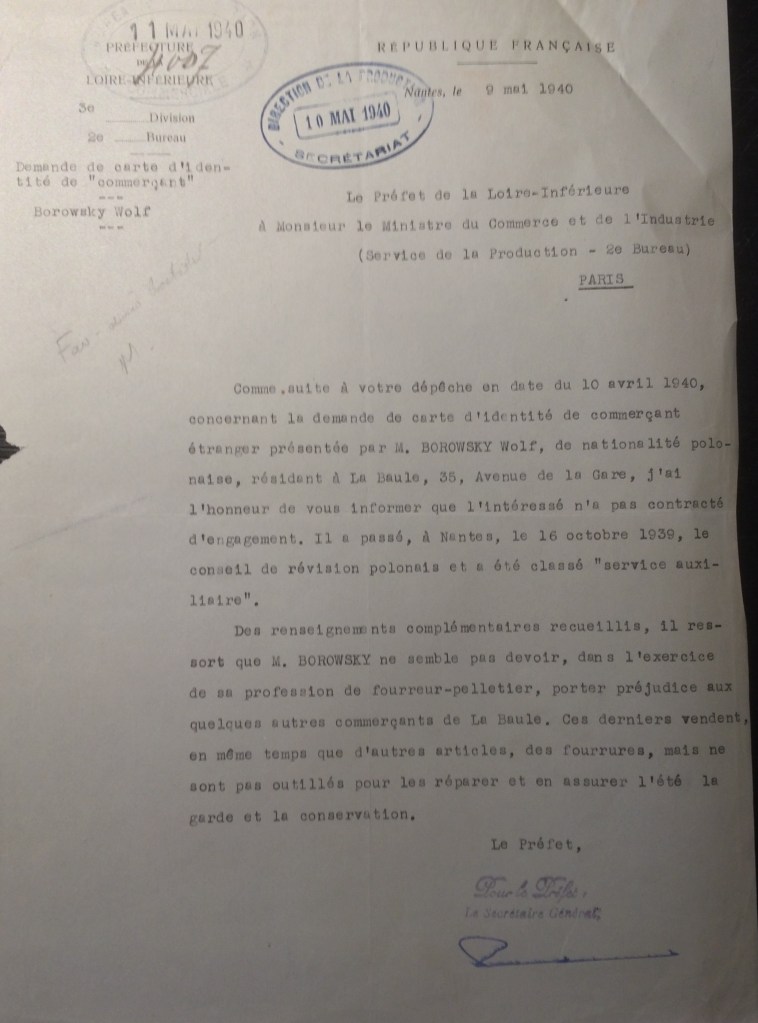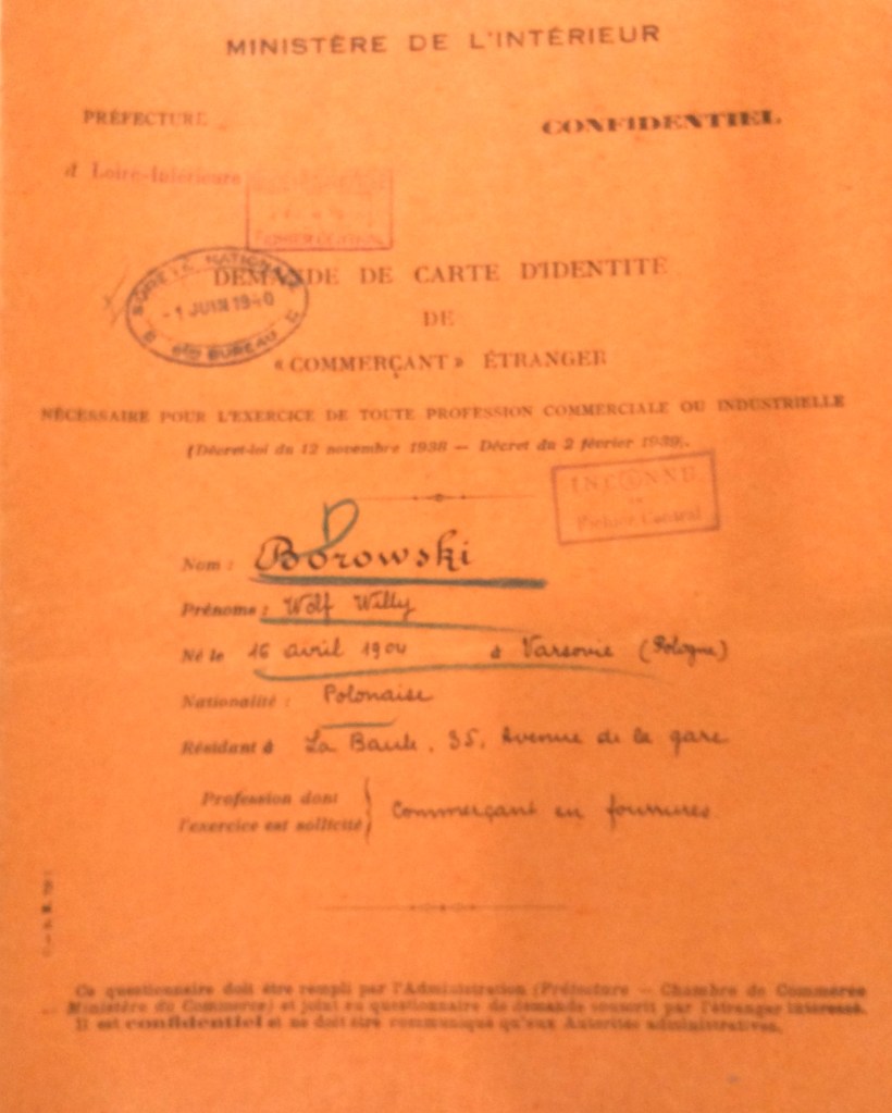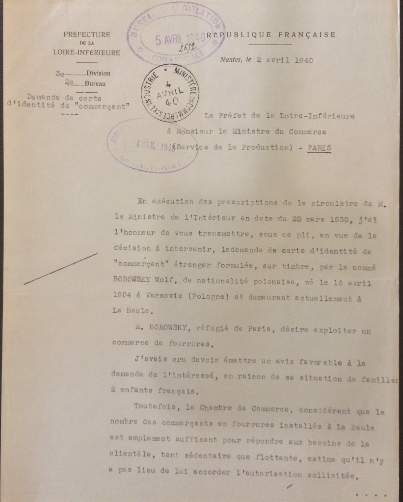 En mars 1940, Wolf BOROWSKI effectue une demande de carte d’identité pour étranger pour le département de Loire-Inférieure mais cette demande malgré un avis favorable de la Préfecture va lui être refusée par la Chambre de Commerce. Son commerce n’a pu donc ouvrir que de septembre 1939 à avril 1940.