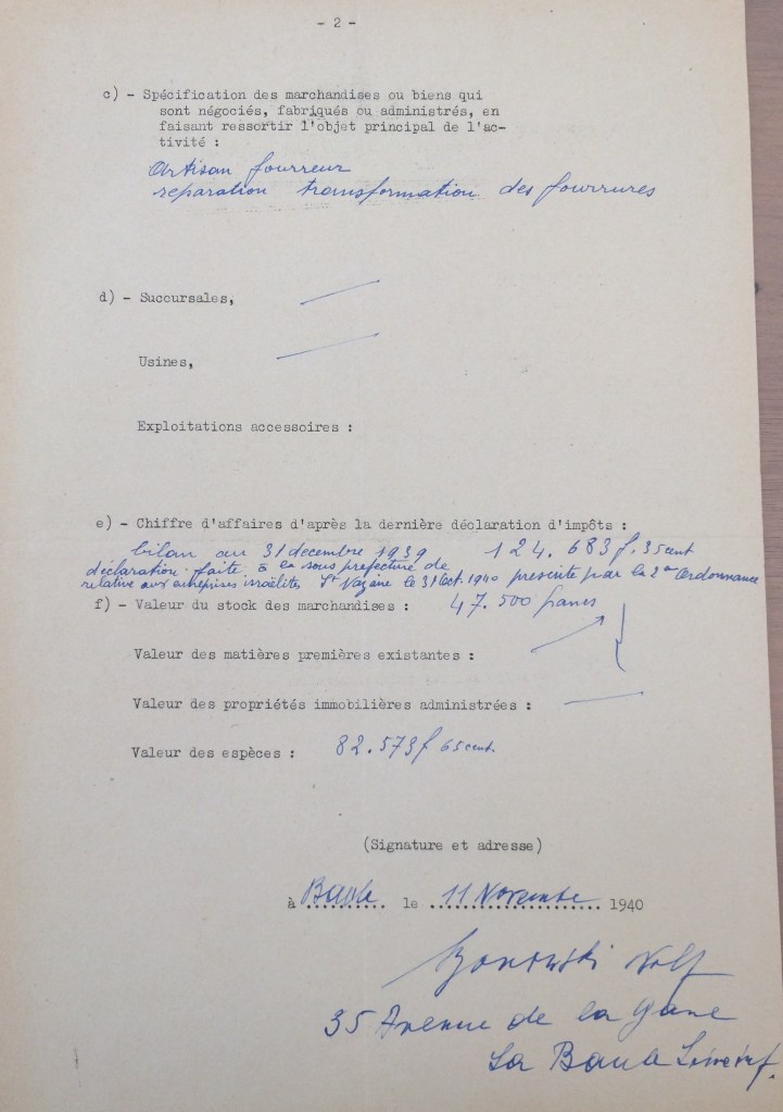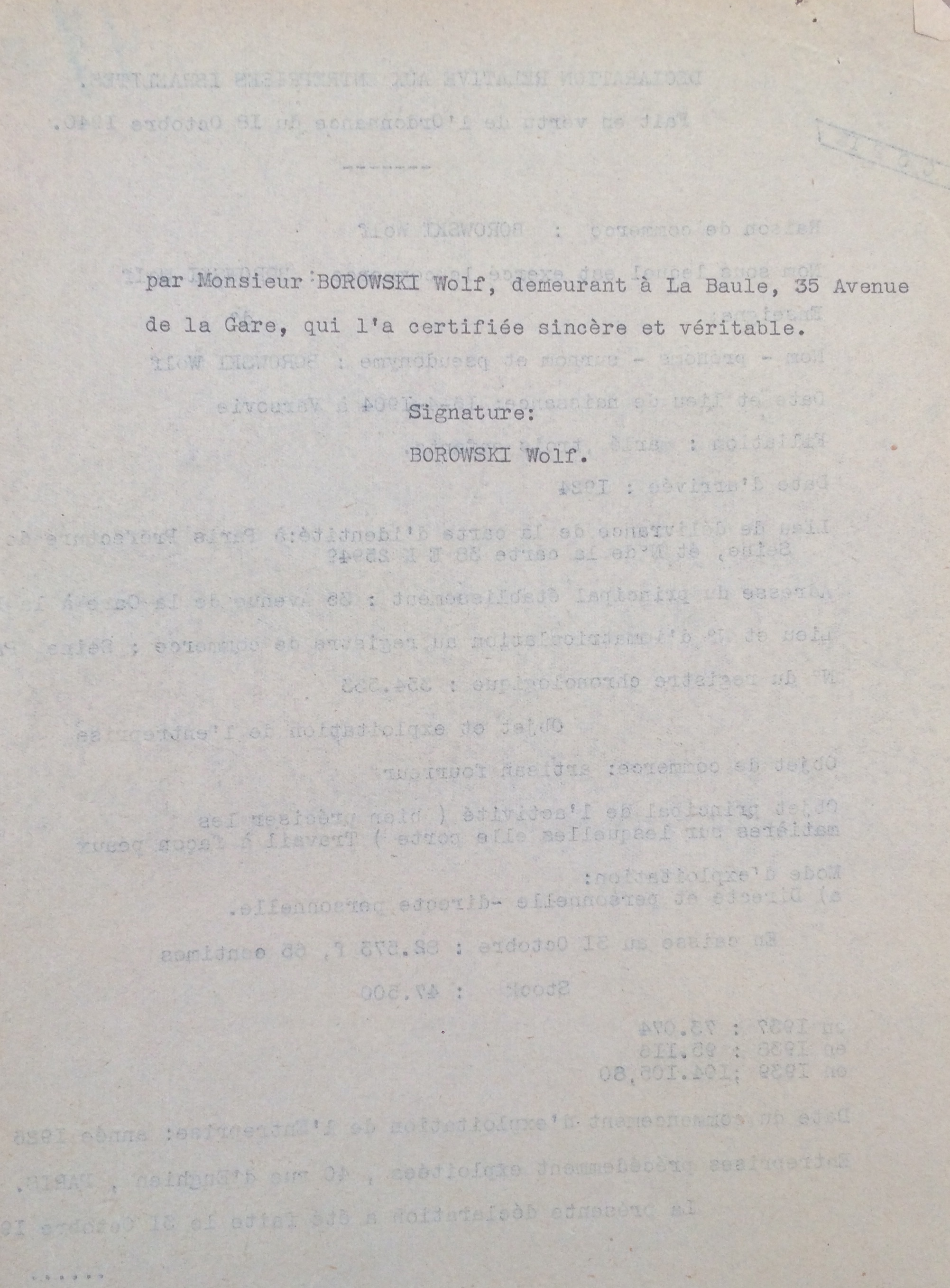 Les procédures d’aryanisation débutent au tout décembre 1940 et suite à la déclaration de Wolf BOROWSKI, les autorités préfectorales tentent de vendre un commerce qui n’existe plus.