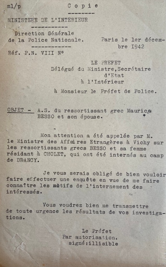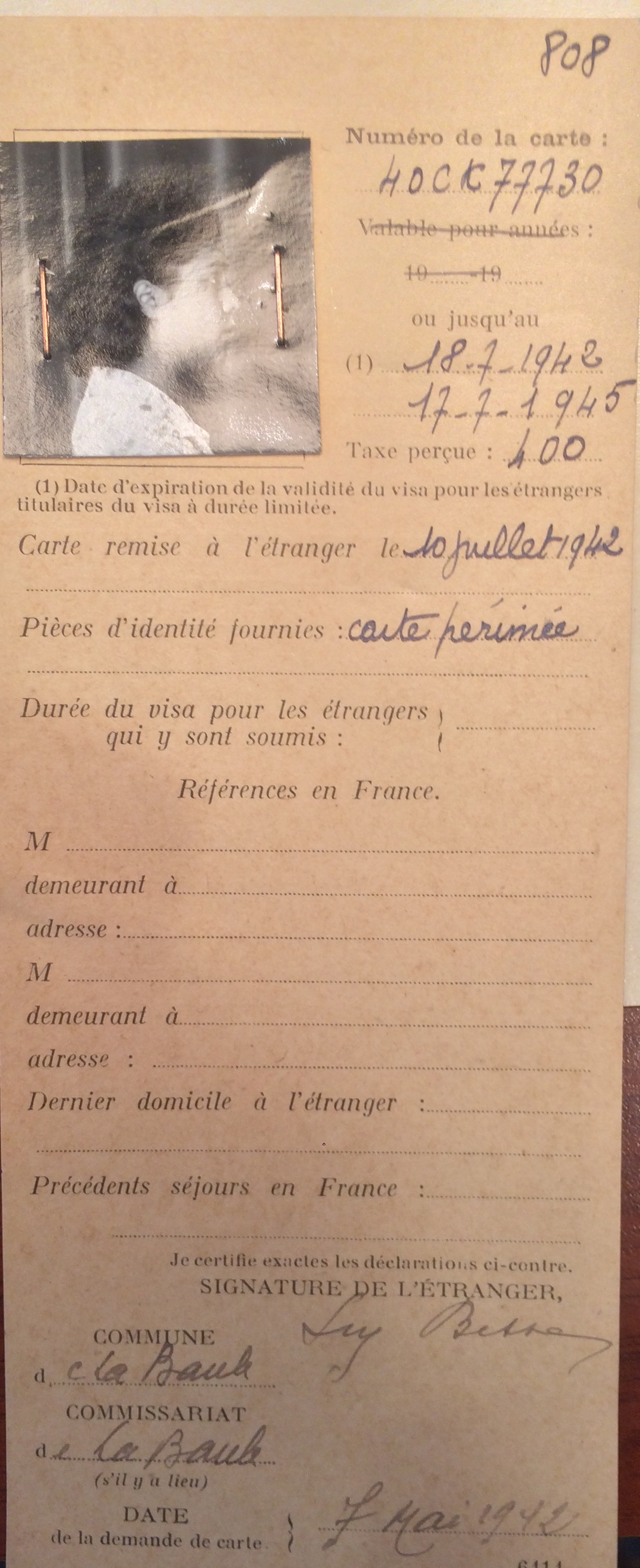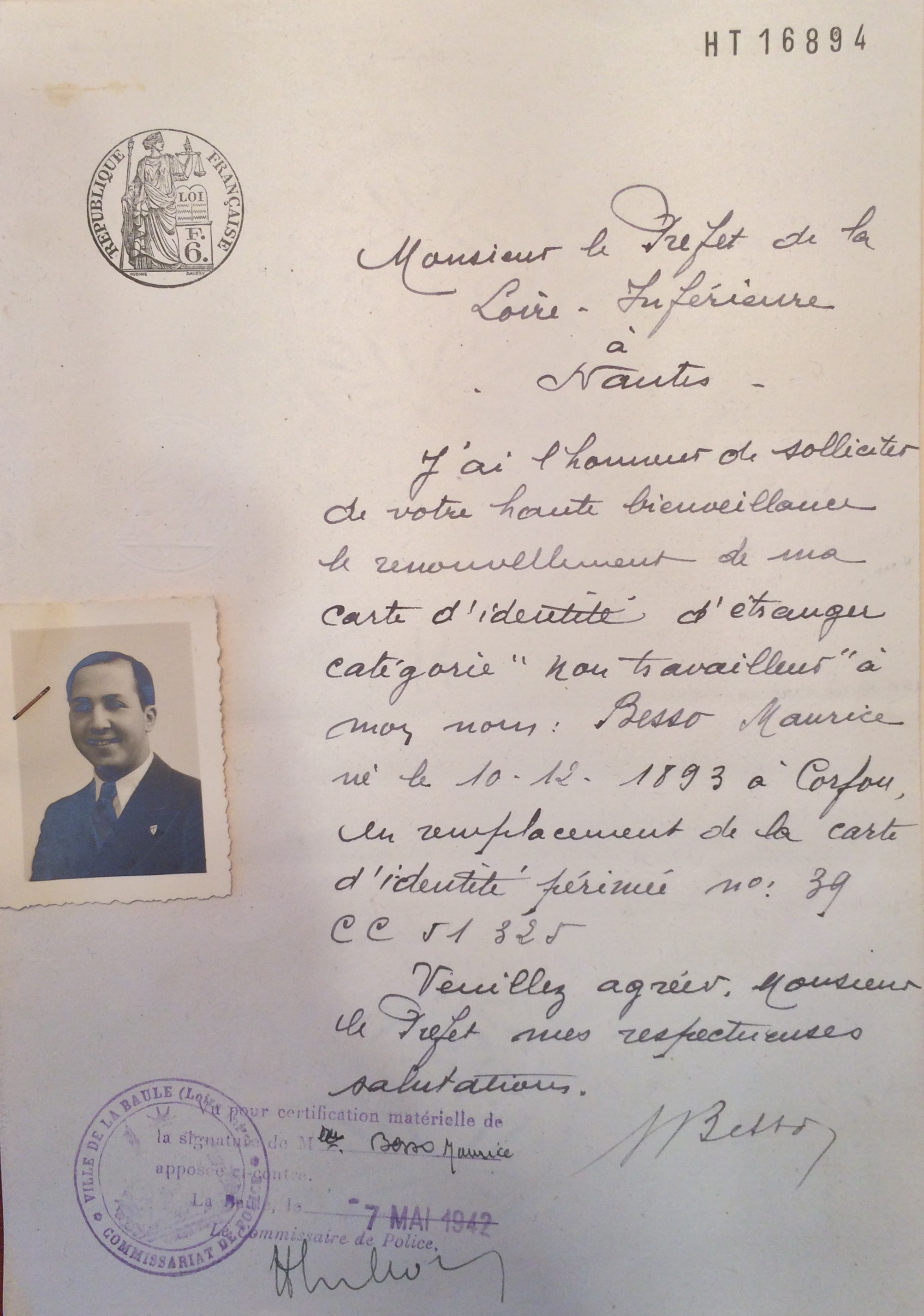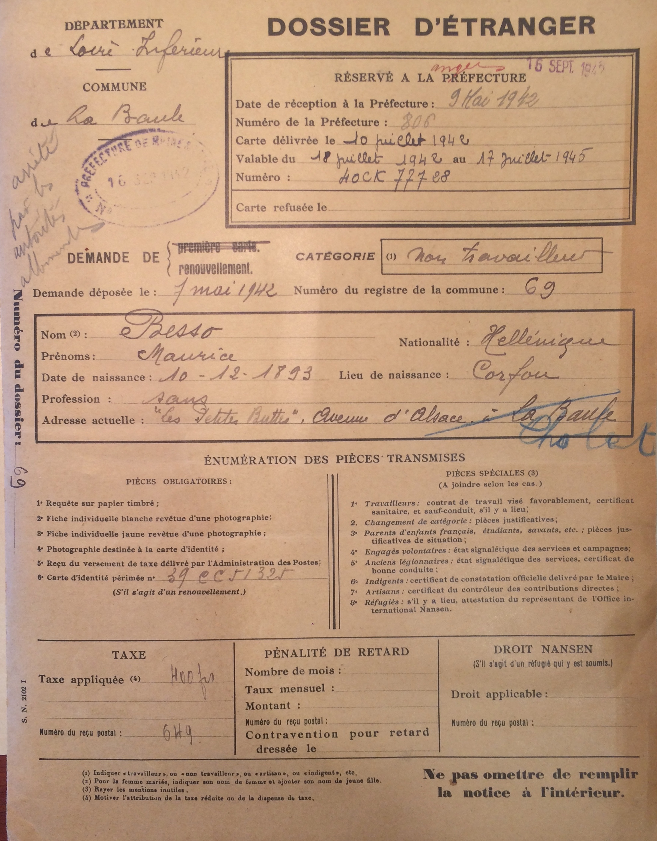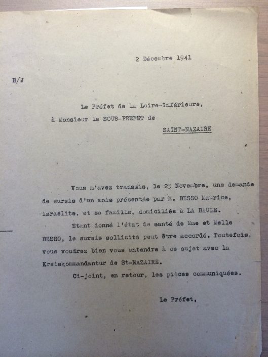 A l’automne 1941, la zone côtière devient « interdite » aux Israëlites étrangers. Maurice BESSO demande alors à bénéficier d’un sursis d’expulsion qui lui est accordé : « Etant donné l’état de santé de madame et mademoiselle BESSO, le sursis sollicité peut être accordé« .