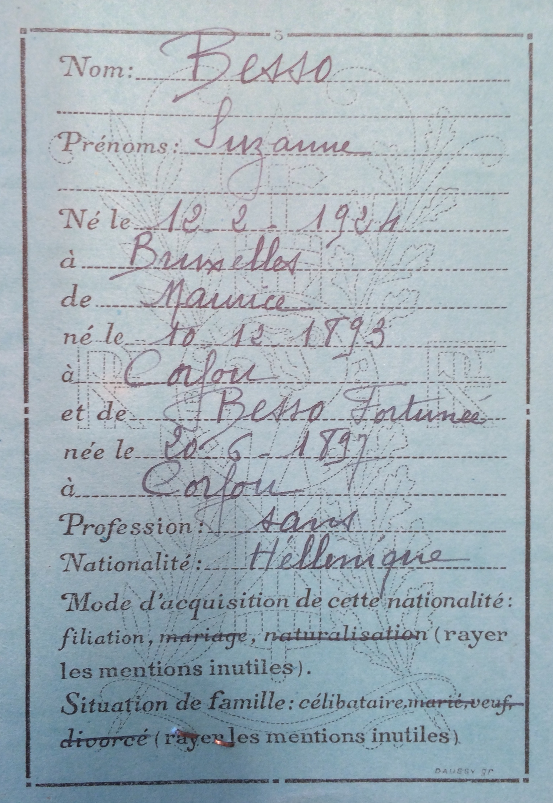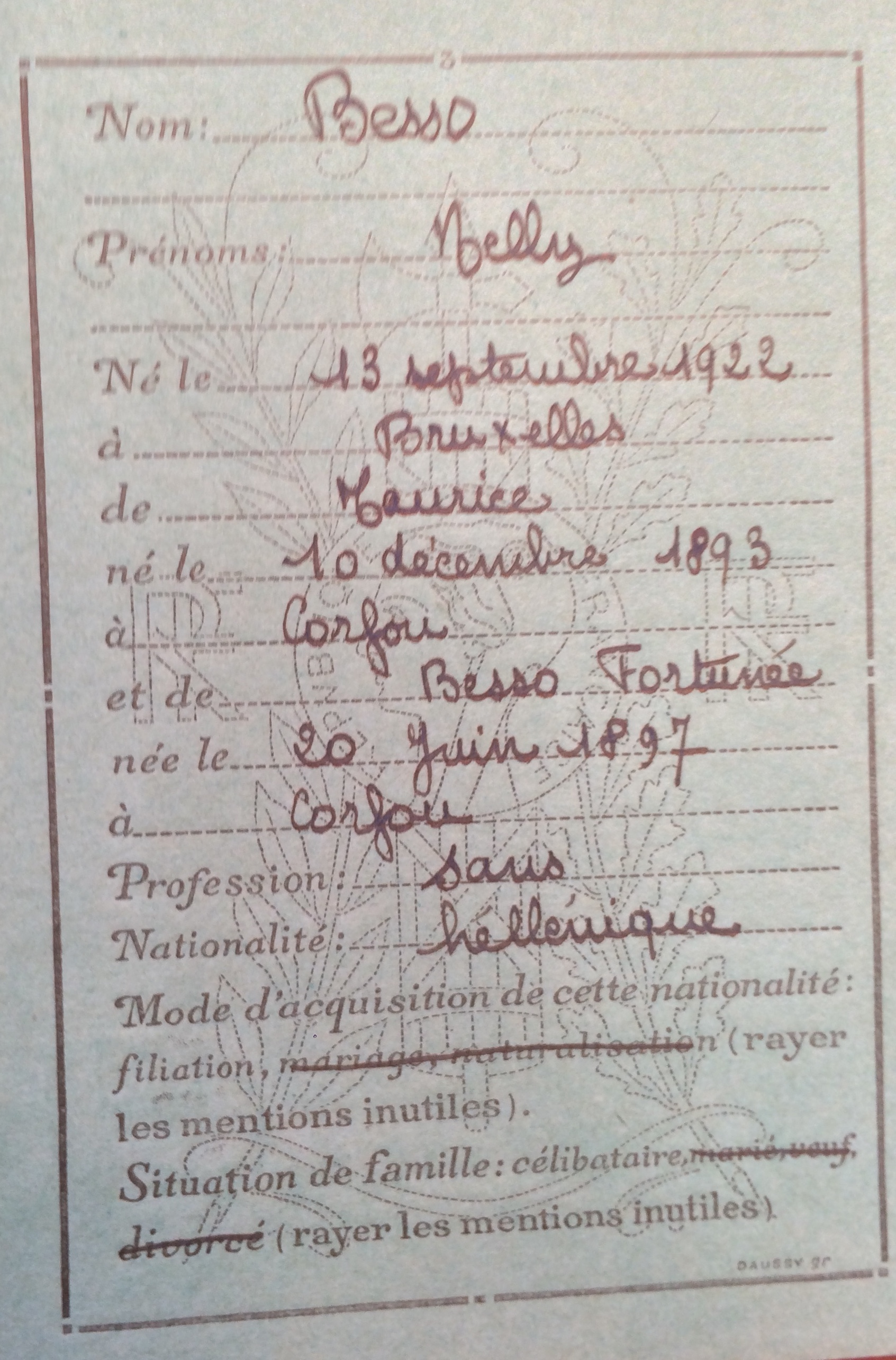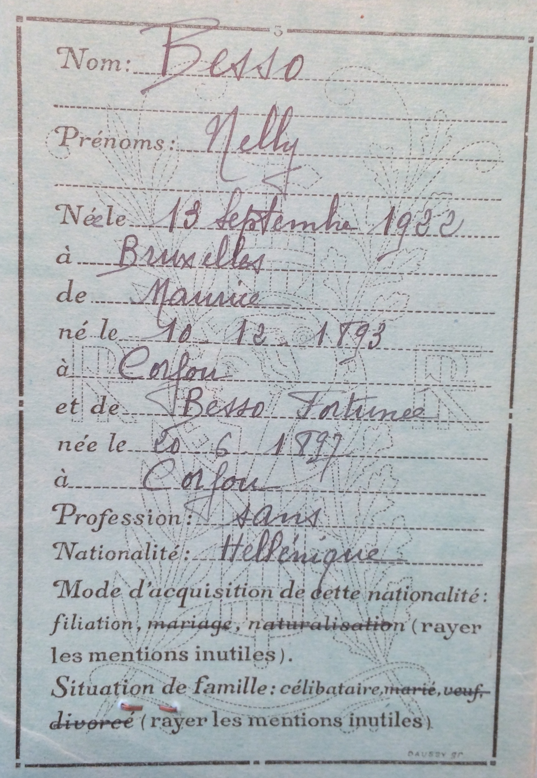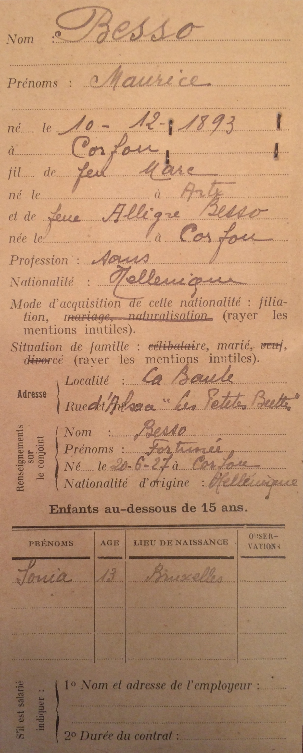 Moïse dit Maurice BESSO est né le 10 décembre 1893 à Corfou (Grèce) [Père: Marc BESSO et Mère : Simha BESSO] et est marié avec Fortunée (ou Eutichia) BESSO née le 20 juin 1897 à Corfou (Grèce) [Père : Gabriel BESSO et Mère : Esther ZACHAR]. Le couple a quatre enfants : Marc né le 13 septembre 1919 à Corfou, Nelly Allegra Esther née le 11 septembre 1922, Suzanne Jacqueline née le 12 février 1924 et Sonia Gabrielle Liliane née le 20 janvier 1929, les trois derniers enfants étant nés à Ixelles.