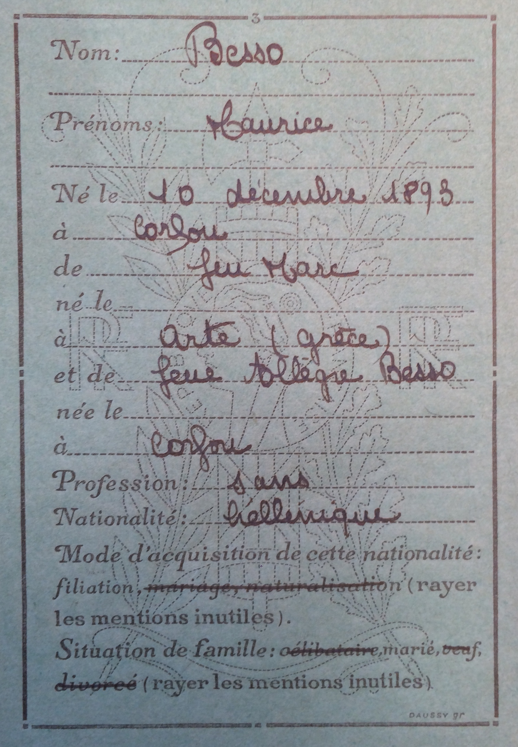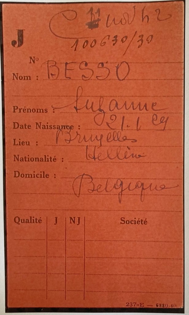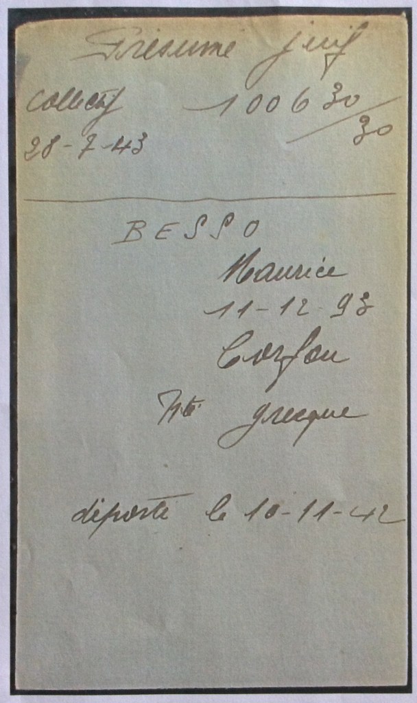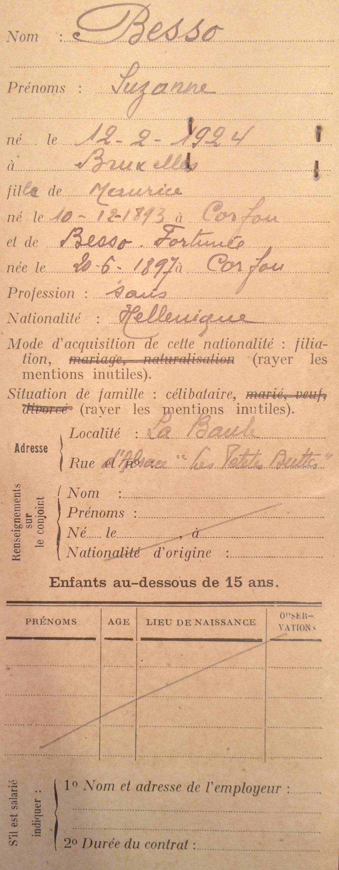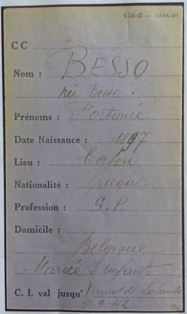 Moïse dit Maurice BESSO est né le 10 décembre 1893 à Corfou (Grèce) [Père: Marc BESSO et Mère : Simha BESSO] et est marié avec Fortunée (ou Eutichia) BESSO née le 20 juin 1897 à Corfou (Grèce) [Père : Gabriel BESSO et Mère : Esther ZACHAR]. Le couple a quatre enfants : Marc né le 13 septembre 1919 à Corfou, Nelly Allegra Esther née le 11 septembre 1922, Suzanne Jacqueline née le 12 février 1924 et Sonia Gabrielle Liliane née le 20 janvier 1929, les trois derniers enfants étant nés à Ixelles.