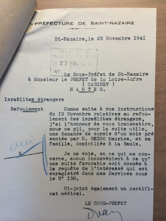 courrier de la sous-préfecture de Saint-Nazaire au Préfet de Loire-Inférieure du 25 novembre 1941 et 02 décembre 1941 sur le refoulement des israëlites étrangers [ADLA1694W21]