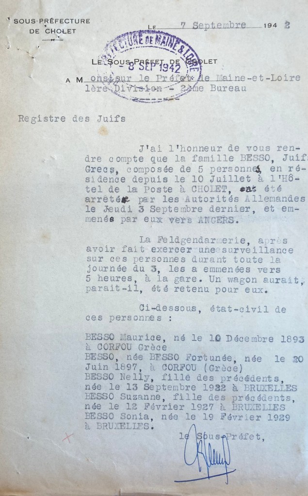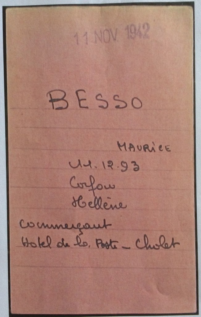 Ils arrivent le 10 juillet 1942 à l’Hôtel de la Poste 30, boulevard Gustave Richard à Cholet. « Mme MERCERON accepta de les loger avec tous les siens jusqu’à ce que les dénonciations multiples eurent alerté les Allemands…. Mais une lettre anonyme signala un jour qu’au moment où les Français devaient s’imposer tant de privations, il était anormal de nourrir des métèques. Je mis cette lettre au panier. Il est probable qu’une dénonciation parvint à la Kommandantur, car quelque jours plus tard cette famille st arrêtée. Nous pûmes aussitôt cacher ses bagages et, par la suite, lui faire parvenir une partie des effets au camp de Drancy. Mme MERCERON, qui se montra courageuse, put même lui faire remettre une partie de son argent. Malheureusement, je ne sais pas ce qui s’était passé à La Baule ; mais l’ami qui m’avait adressé cette famille fut arrêté, ainsi que le propriétaire du car qui avait fait le transport. Quelques jours plus tard, le commissaire aux Affaires Juives vint à Cholet. Il possédait une documentation complète sur la famille BESSO et me demanda ce qu’étaient devenus les bagages. Je lui dis qu’ils devaient être dans une un local que BESSO avait loué près de la gare. Il alla en prendre possession, fit un inventaire et nous laissa un reçu de tout. J’ai su depuis qu’une nièce de l’intéressé avait noué des relations avec un officier allemand d’Angers et sans doute avait parlé, car elle était en mauvais termes avec son oncle. » [Darmaillacq, A. ; Cholet sous l’Occupation ; Cholet : Imprimerie du Centre, 1946, rééd. 1991 ; pp. 44-45 in BOSSY, B. Histoire de la déportation des Juifs dans les Mauges ; La Crèche : Geste Editions, 2014″