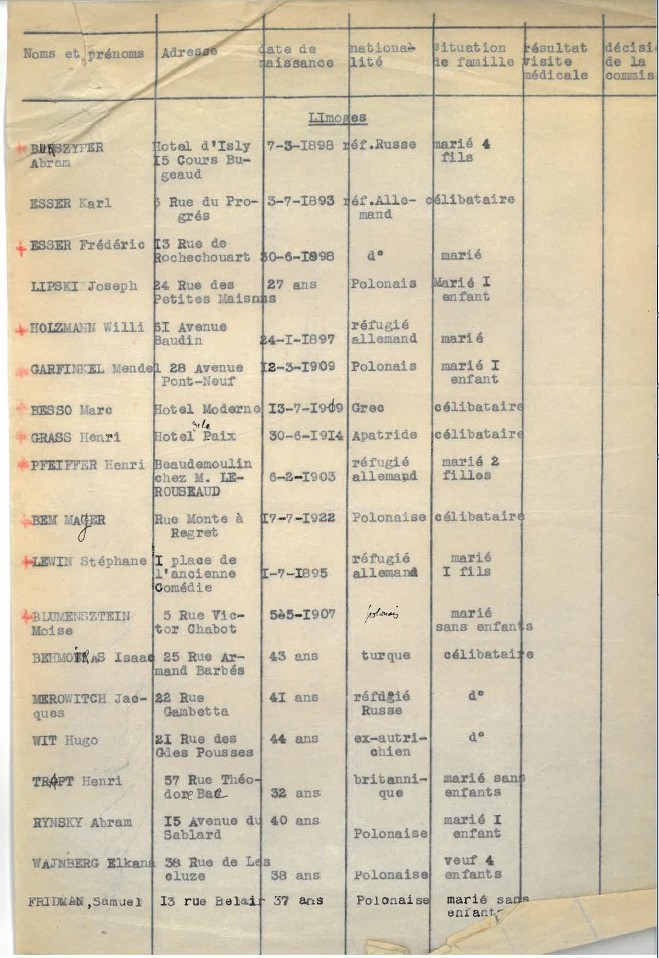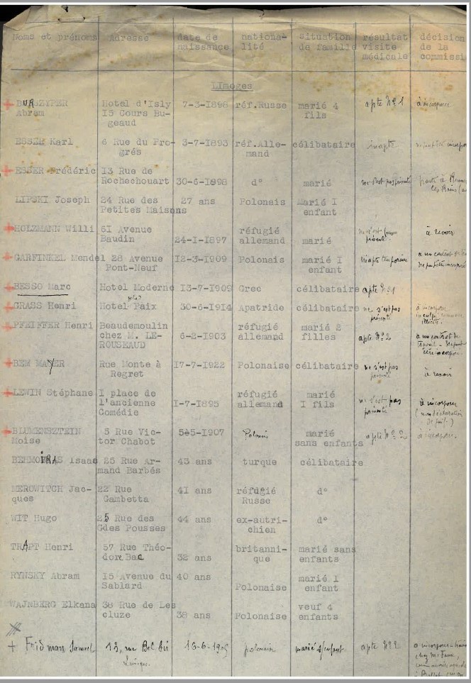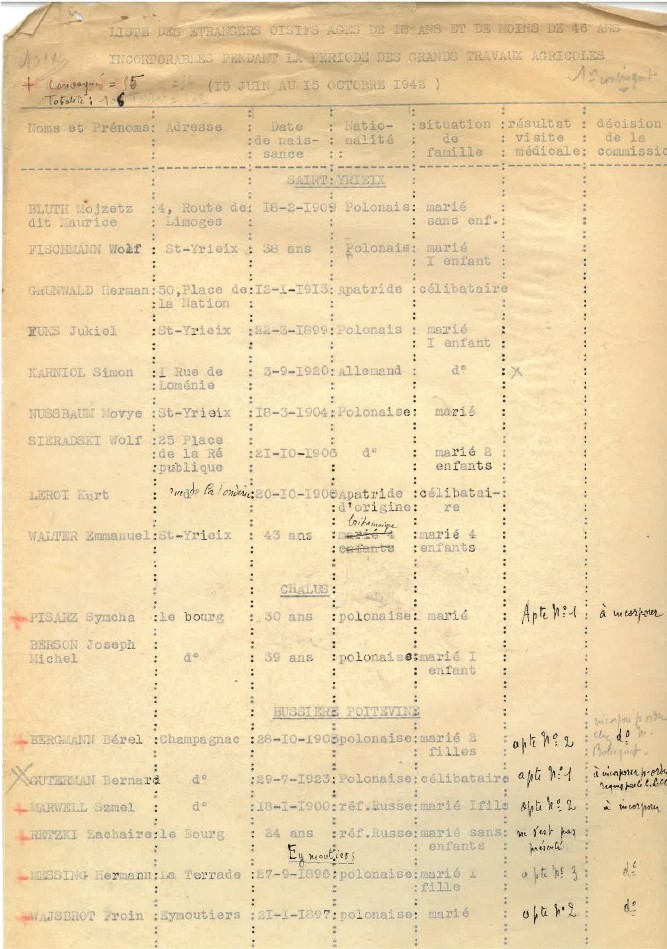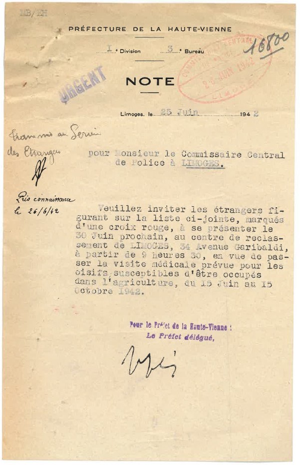 Fin juin 1942, Marc est sommé de rejoindre le Centre de Recensement de Limoges au 34, avenue Garibaldi afin d’y effectuer une visite médicale, je cite « pour les oisifs susceptibles d’être occupés dans l’agriculture du 15 juin au 15 octobre 1942″. Nous ignorons si Marc a été employé comme ouvrier agricole dans les fermes de la région de Limoges.