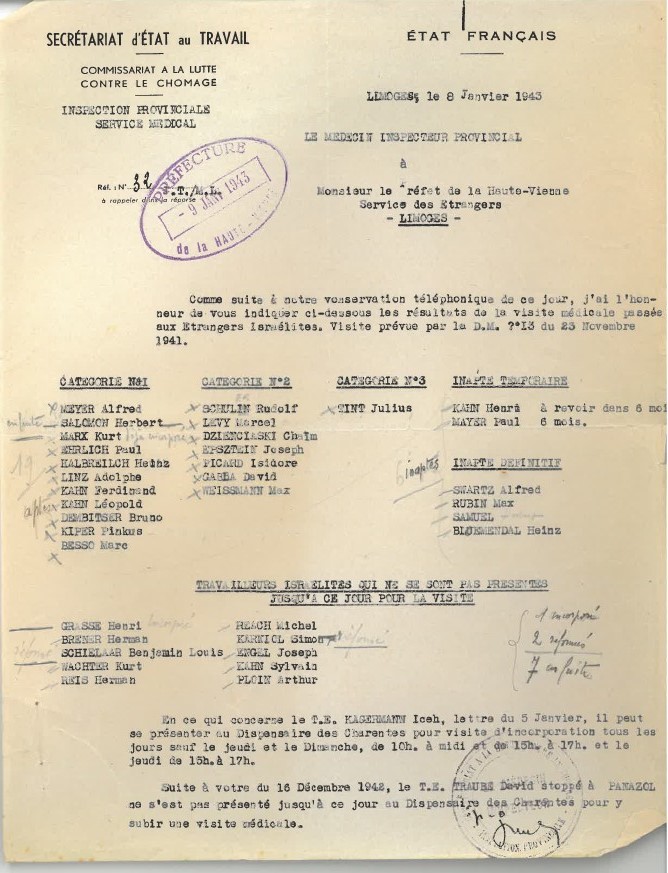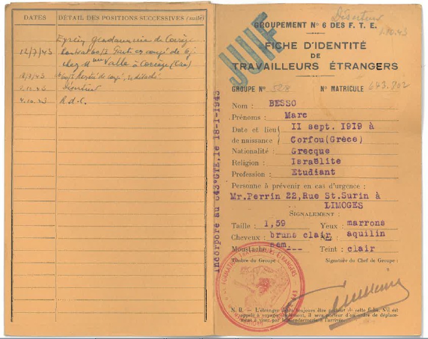 En janvier 1943, les Israélites étrangers passent une visite médicale afin d’être incorporé dans un Groupement de Travailleurs Etrangers. Marc est déclaré apte et incorpore le Groupement numéro 6 des formations d’étrangers le 18 janvier 1943 groupe n°643 à Aix-sur-Vienne (emploi occupé inconnu) puis à compter du 03 février 1943 au groupe n°528 à Uzerche en Corrèze. Il est détaché à l’usine Brachs à Saint-Priest du 03 février au 07 mai 1943 puis le travail terminé détaché chez Monsieur Serve (lieu inconnu) jusqu’au 1er octobre 1943.