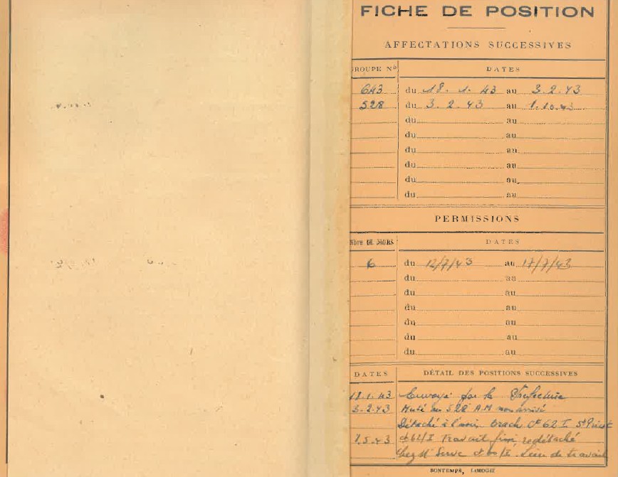 Il part en congé du 12 au 18 juillet 1943 chez Mademoiselle VALLEE à Corrèze (Corrèze) et est déclaré déserteur le 02 octobre 1943.