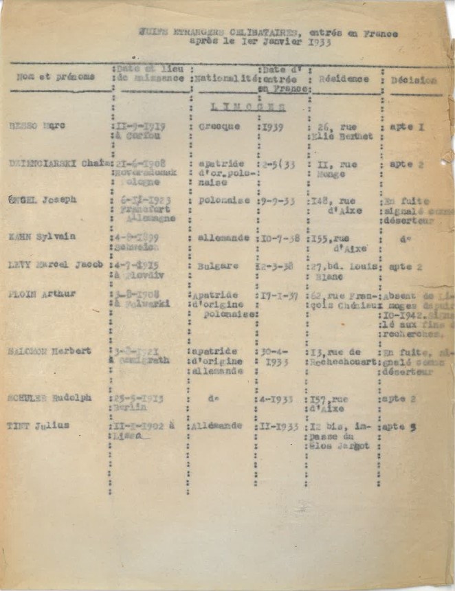 Marc, l’aîné des enfants, comme indiqué par son père en mars 1940, est étudiant à l’Ecole Régionale des Beaux-Arts à Nantes. Marc quitte sa famille et passe la ligne de démarcation entre mars 1940 et 1941 et va résider à Limoges. Il est inscrit à partir de 1941 [AD86, 44J28] et pour l’année scolaire 1942-1943 à Ecole nationale des Arts décoratifs de Limoges. Il réside alors à l’Hôtel Moderne à Limoges. Son père, lors de son séjour à Cholet, s’inquiète du sort de son fils « Il (Maurice BESSO) venait d’ailleurs presque chaque jour à la Mairie ; il tremblait pour ses enfants, et j’ai pu servir d’intermédiaire pour communiquer avec son fils âgé de 22 ans et réfugié en zone libre » in [Darmaillacq, A. ; Cholet sous l’Occupation ; op. citée]
