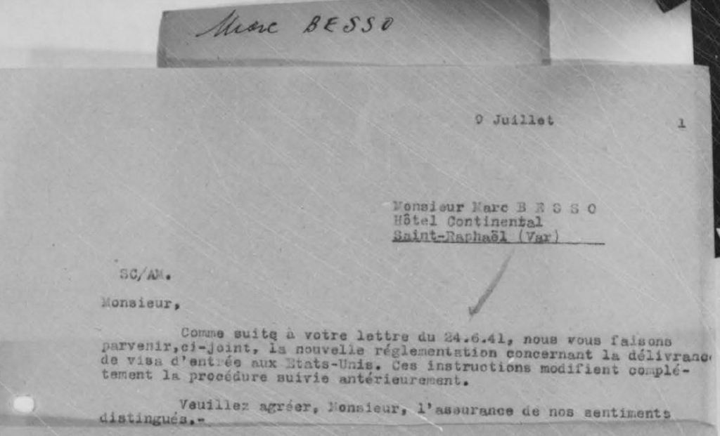 Marc d’ailleurs rejoint un temps la commune de Saint-Raphaël dans le Var (il réside à l’Hôtel Continental) en mai/juin 1941 et s’adresse à la HICEM de Marseille afin de pouvoir migrer aux Etats-Unis. Son père, Maurice, l’a mis en relation avec un ami à lui à New York pour lui faciliter l’obtention d’affidavits nécessaires à la délivrance de billets de passage via paquebot. Malheureusement, les conditions d’entrée ayant changé aux Etats-Unis à cette époque, sa demande n’aboutira pas. [C’est aux parents ou amis aux Etats-Unis de déposer une demande d’ immigration auprès des services d’immigration à Washington avec affidavits, cautions morale et politique et prix du passage à verser et non plus l’inverse auparavant)