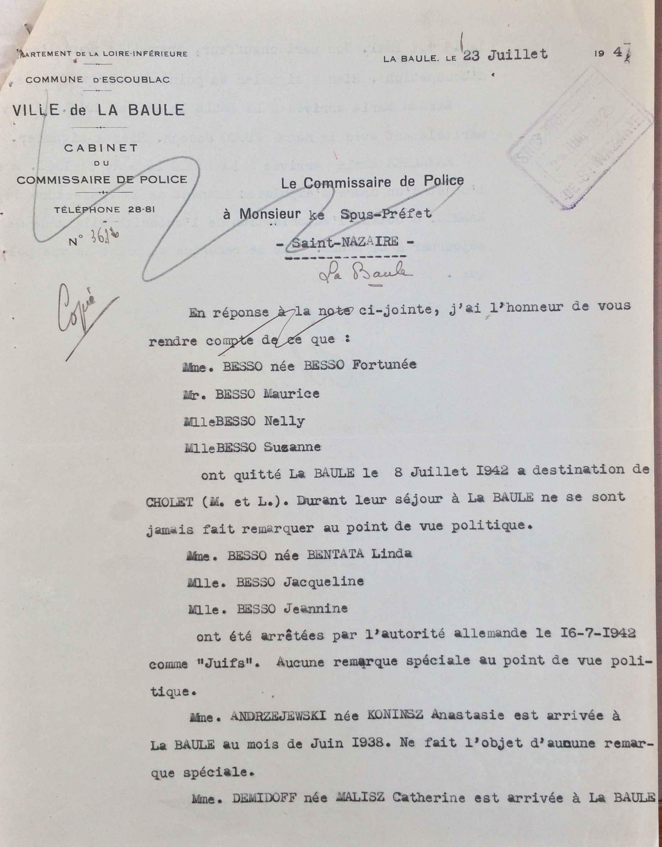 La famille BESSO Maurice quitte La Baule le 07 juillet [ADML 303W290] pour arriver au plus tard le 10 juillet 1942 à Cholet [ADML 7W1].