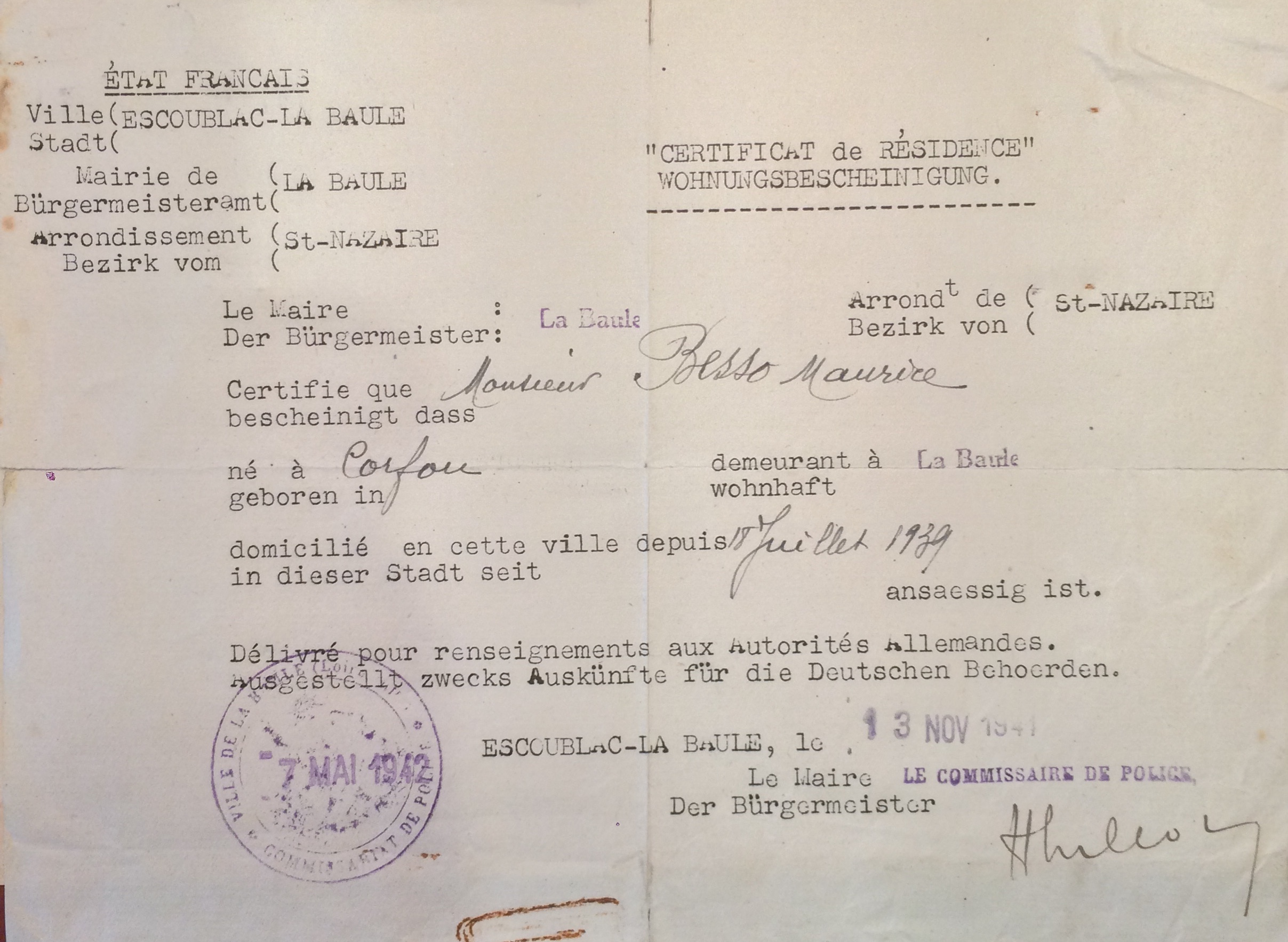 Entre le 27 septembre et le 20 octobre 1940, Maurice BESSO se fait recenser auprès de la sous-préfecture de Saint-Nazaire sous le numéro 138. Juste après, sa belle-soeur Linda et ses trois enfants se font recenser et habitent tout près Villa Martine, Avenue d’Alsace/Avenue de Lorraine à La Baule.