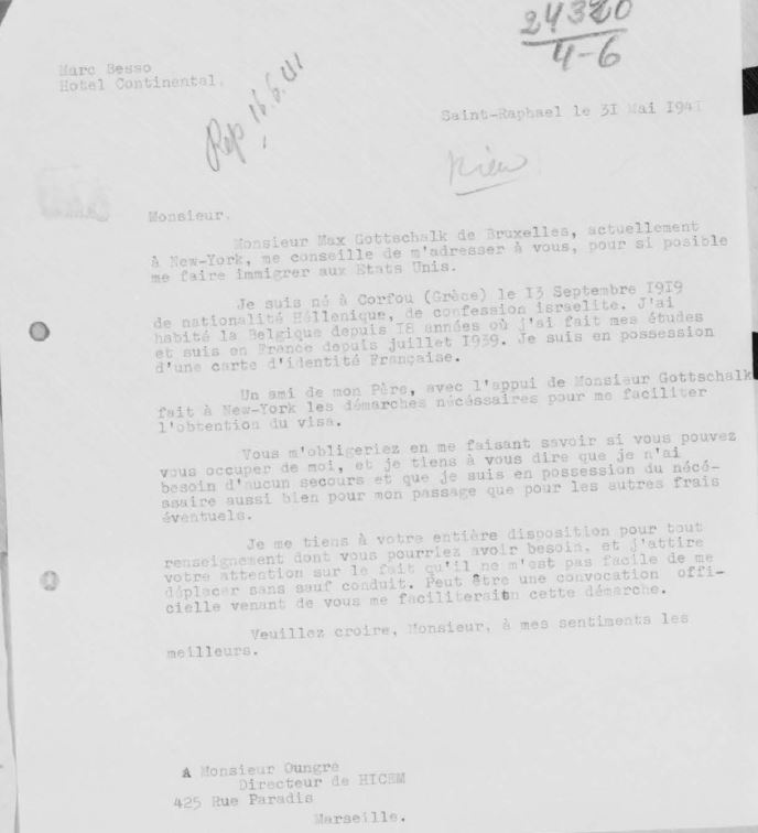 Marc d’ailleurs rejoint un temps la commune de Saint-Raphaël dans le Var (il réside à l’Hôtel Continental) en mai/juin 1941 et s’adresse à la HICEM de Marseille afin de pouvoir migrer aux Etats-Unis. Son père, Maurice, l’a mis en relation avec un ami à lui à New York pour lui faciliter l’obtention d’affidavits nécessaires à la délivrance de billets de passage via paquebot. Malheureusement, les conditions d’entrée ayant changé aux Etats-Unis à cette époque, sa demande n’aboutira pas. [C’est aux parents ou amis aux Etats-Unis de déposer une demande d’ immigration auprès des services d’immigration à Washington avec affidavits, cautions morale et politique et prix du passage à verser et non plus l’inverse auparavant)