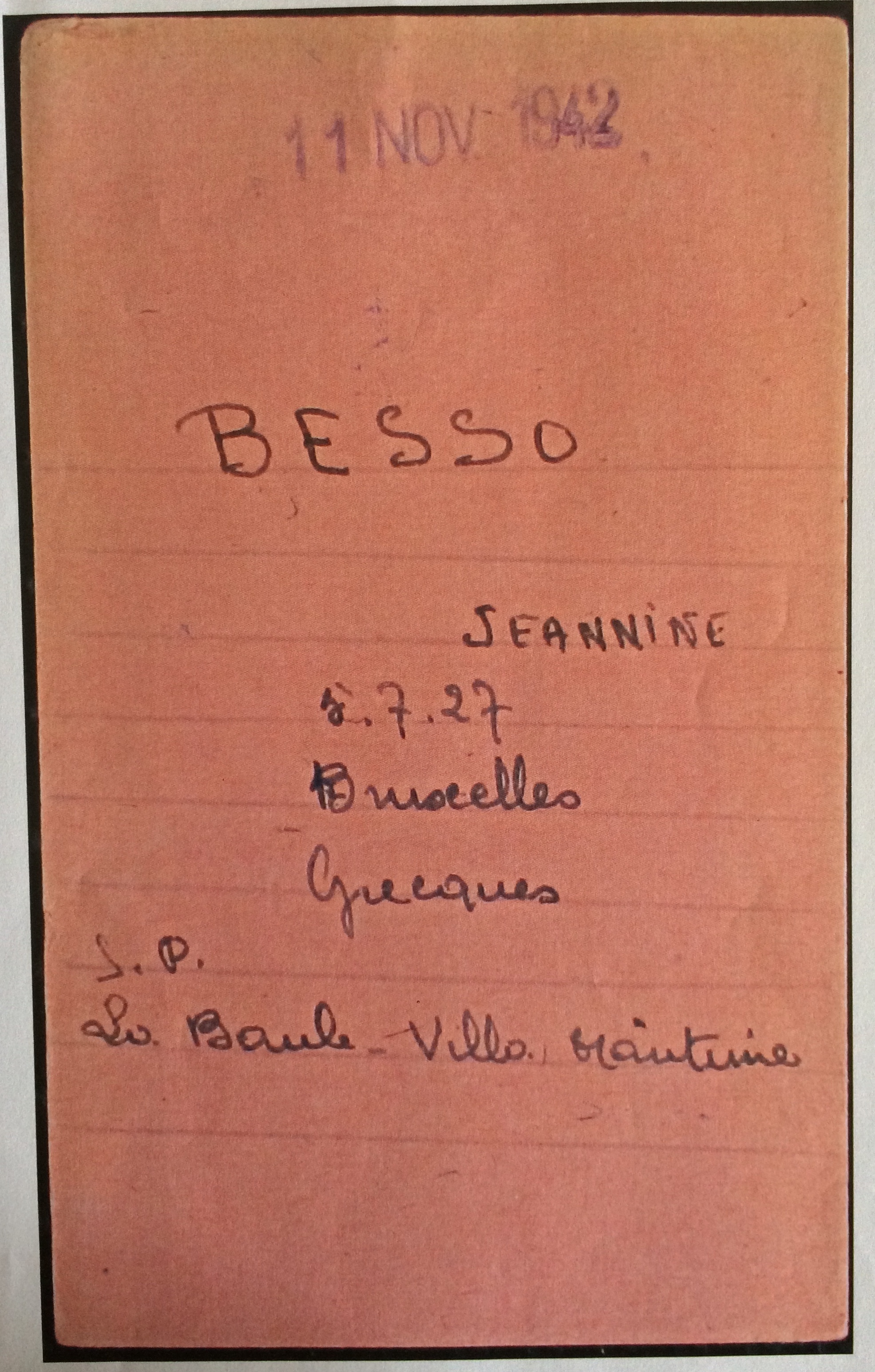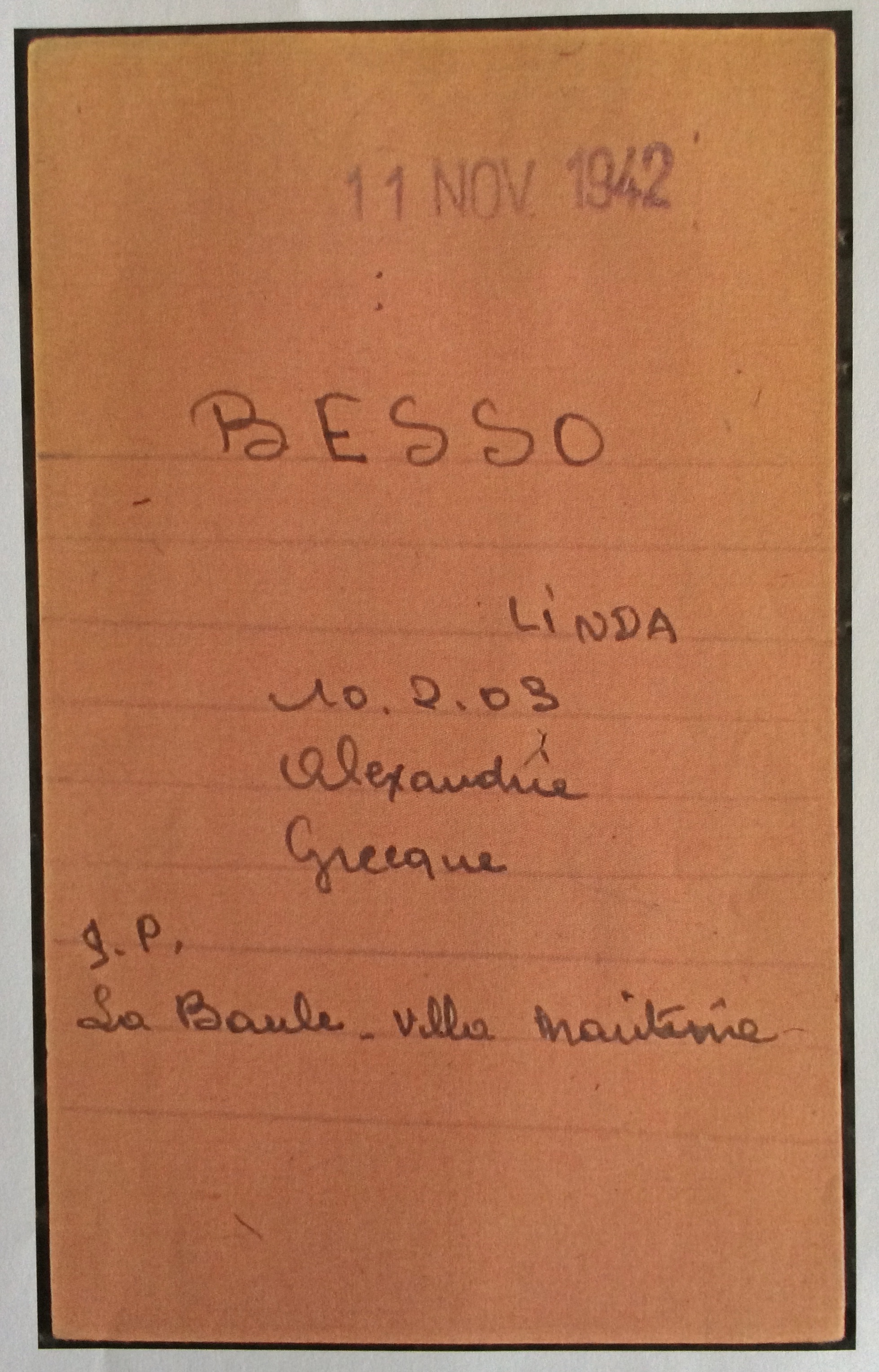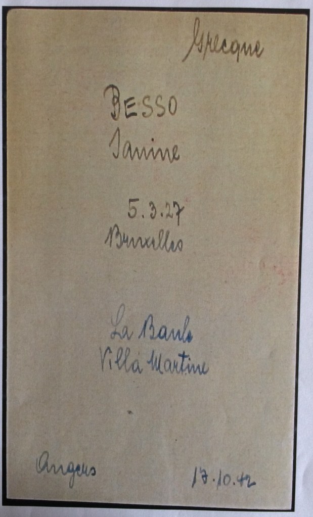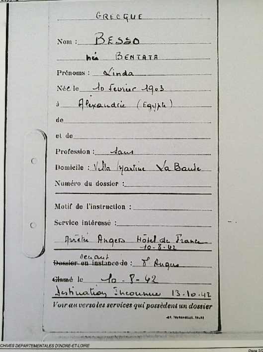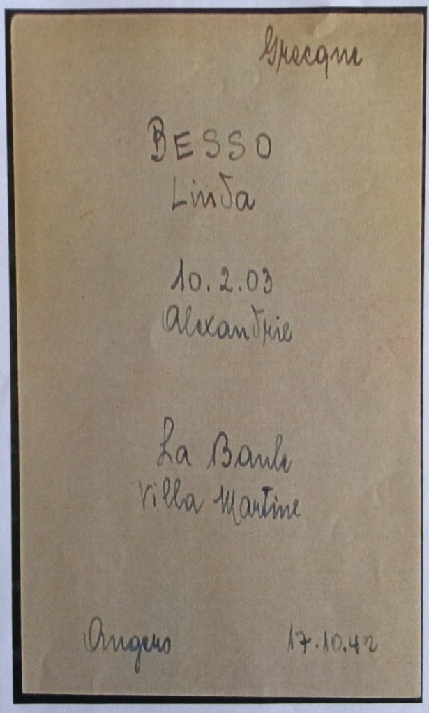 Linda BESSO née BENTATA est née à Alexandrie (Egypte) le 10 février 1903. Elle était mariée avec Robert (Abraham) BESSO né le 26 mars 1890 à Corfou (Grèce) mais qui est décédé à Vittel le 09 août 1937 d’une crise cardiaque (source famille BENTATA). Le couple a trois enfants : Jacqueline Rina, l’aînée, née le 11 juillet 1924 à Bruxelles, Janine la cadette née le 05 juillet 1927 à Bruxelles et Marc Alfred dit Freddy né le 18 février 1929 à Bruxelles.