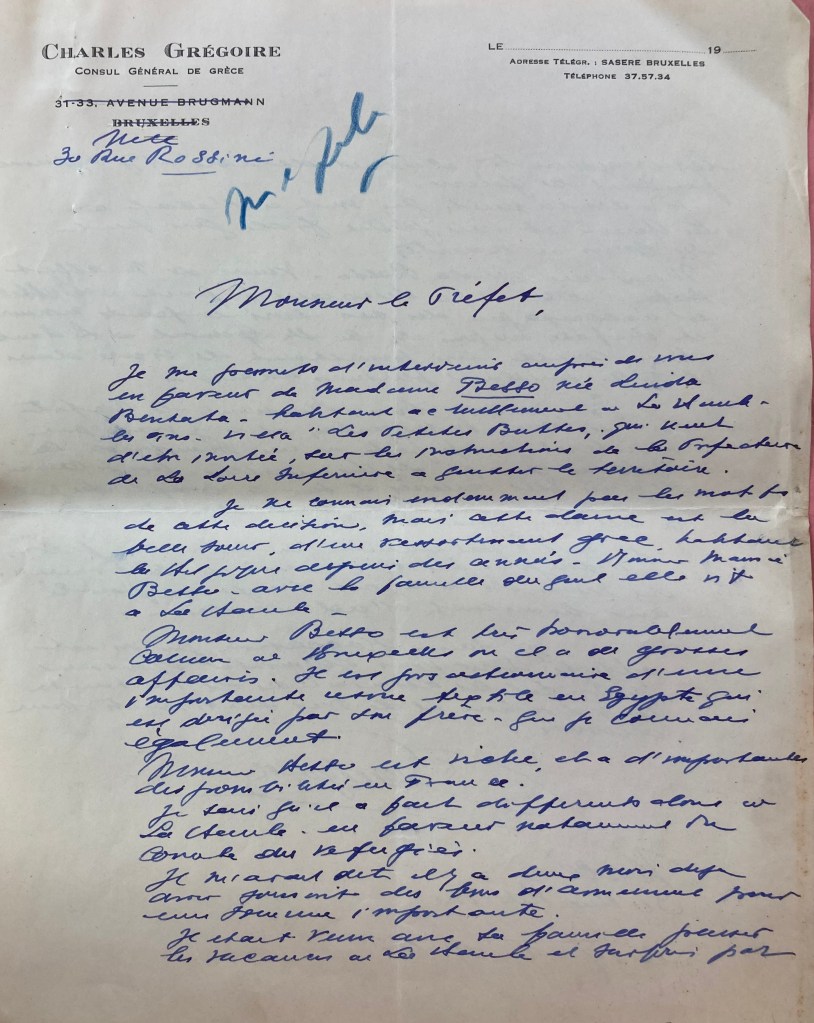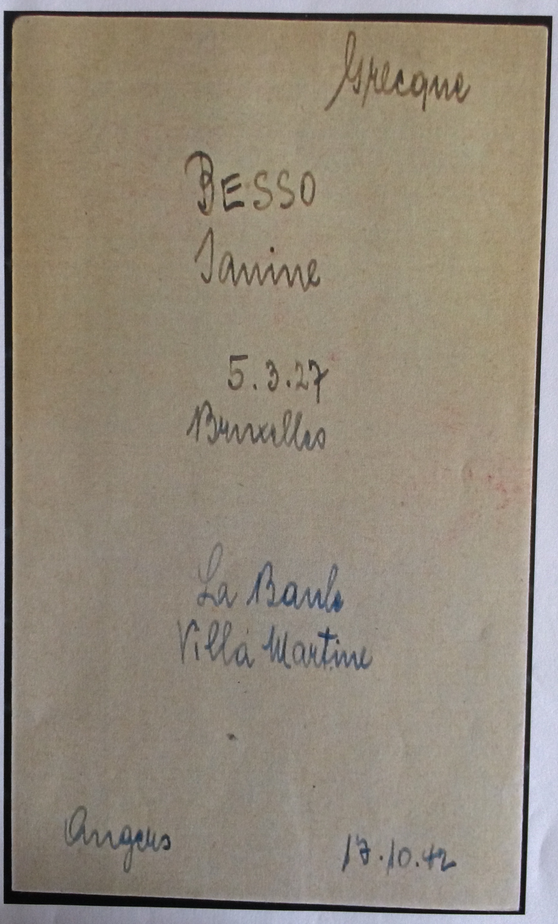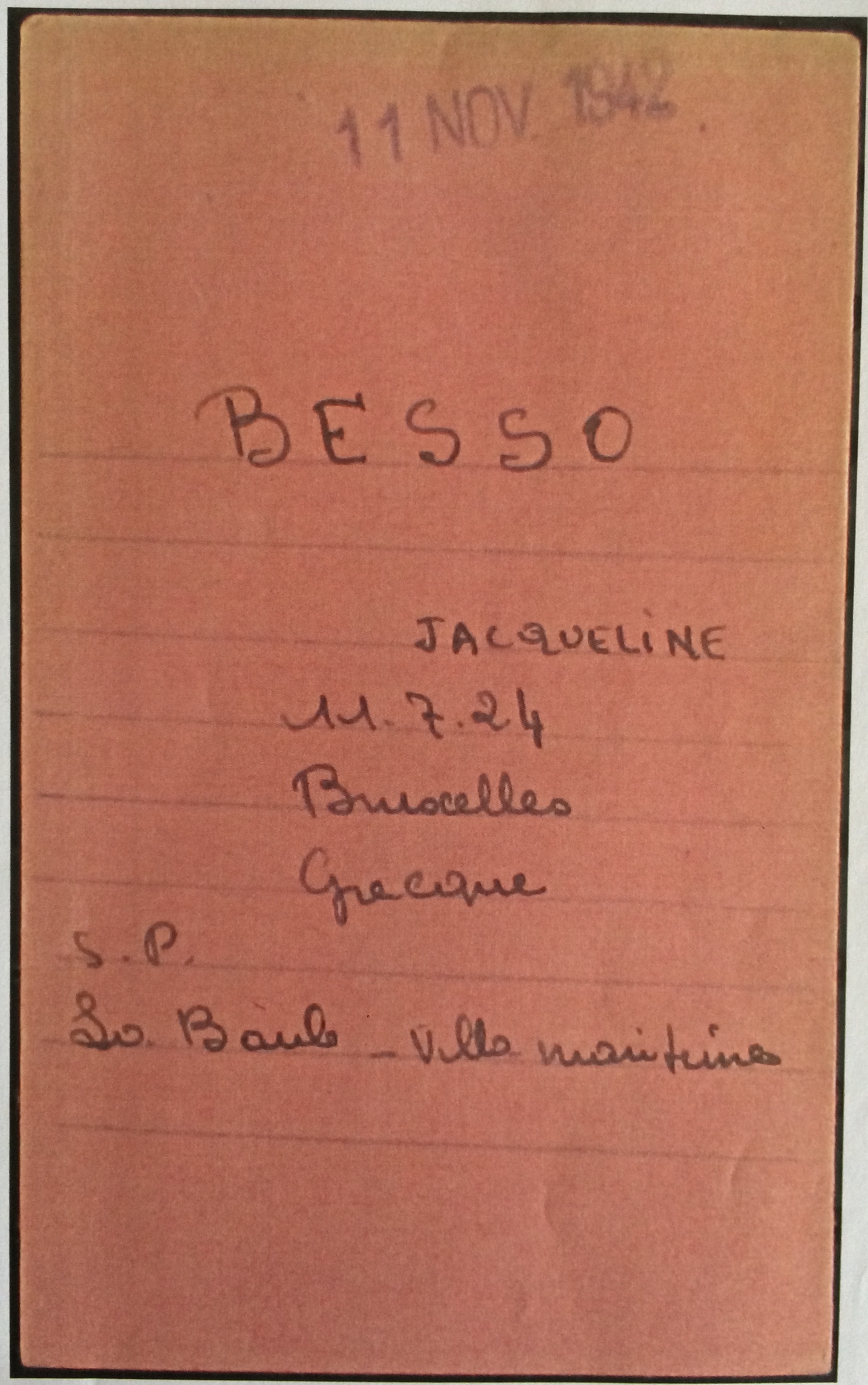 Linda BESSO née BENTATA est née à Alexandrie (Egypte) le 10 février 1903. Elle était mariée avec Robert (Abraham) BESSO né le 26 mars 1890 à Corfou (Grèce) mais qui est décédé à Vittel le 09 août 1937 d’une crise cardiaque (source famille BENTATA). Le couple a trois enfants : Jacqueline Rina, l’aînée, née le 11 juillet 1924 à Bruxelles, Janine la cadette née le 05 juillet 1927 à Bruxelles et Marc Alfred dit Freddy né le 18 février 1929 à Bruxelles.