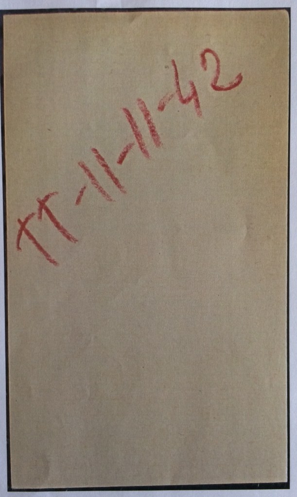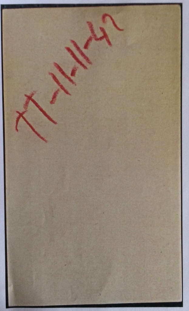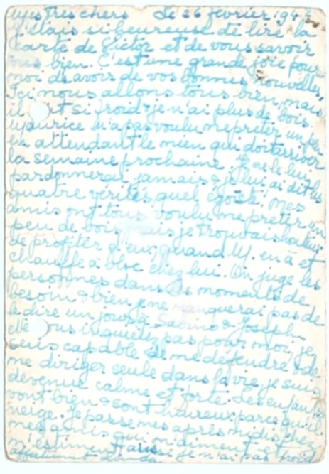 Malgré tout ça, nous sommes tous plus gros qu’avant guerre ainsi nous avons des réserves ; tant qu’on sera ici, on pourra s’arranger. Nous avons tous de gros manteaux pour l’hiver mais il n’y a pas moyen d’acheter des souliers, la vente étant interdite, même pas des pantoufles, il faut faire une demande, on ne donne … [Illisible]… de souliers.