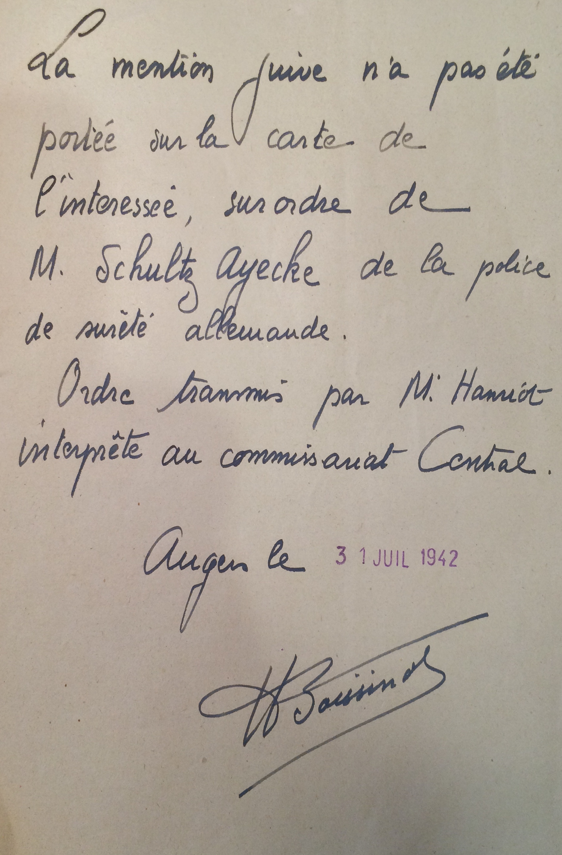 La famille est assignée à résidence à l’Hôtel de France, place de la Gare à Angers à compter du 27 juillet 1942. Au moment de la réception de la nouvelle carte d’identité de Jacqueline (l’ancienne ayant été perdue par les autorités d’occupation au moment de son internement au Grand Séminaire) il est demandé à ce que la mention Juif n’y soit pas apposée.