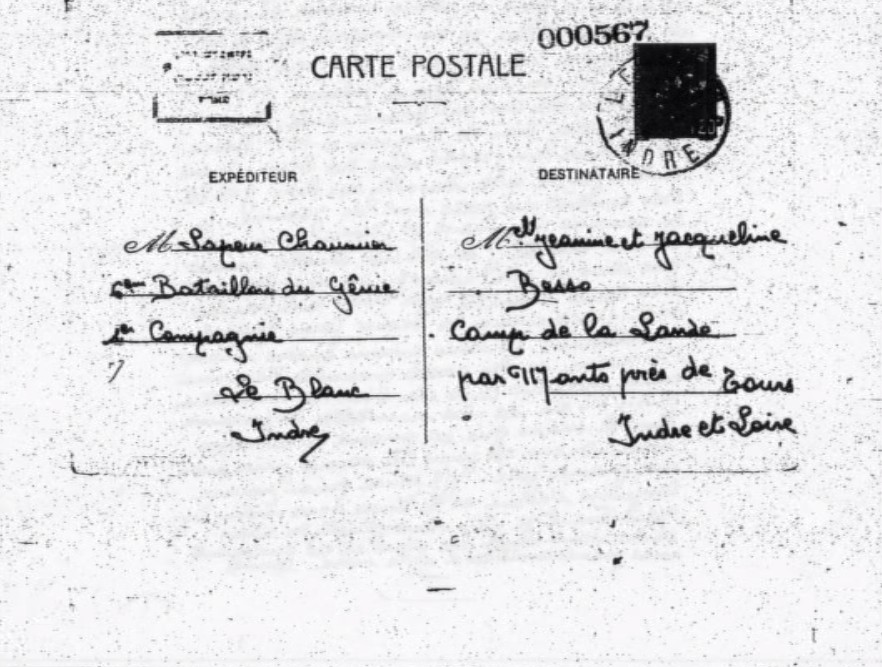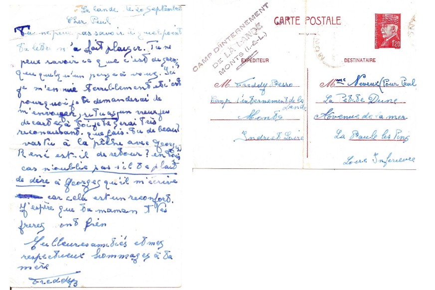 Au camp de La Lande, Marc dit Freddy BESSO écrit une lettre à son meilleur ami, Paul [CLAYESSENS] à La Baule par l’intermédiaire de Madame NEVEUX habitant Villa La Petite Dune, avenue de la mer :