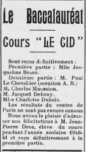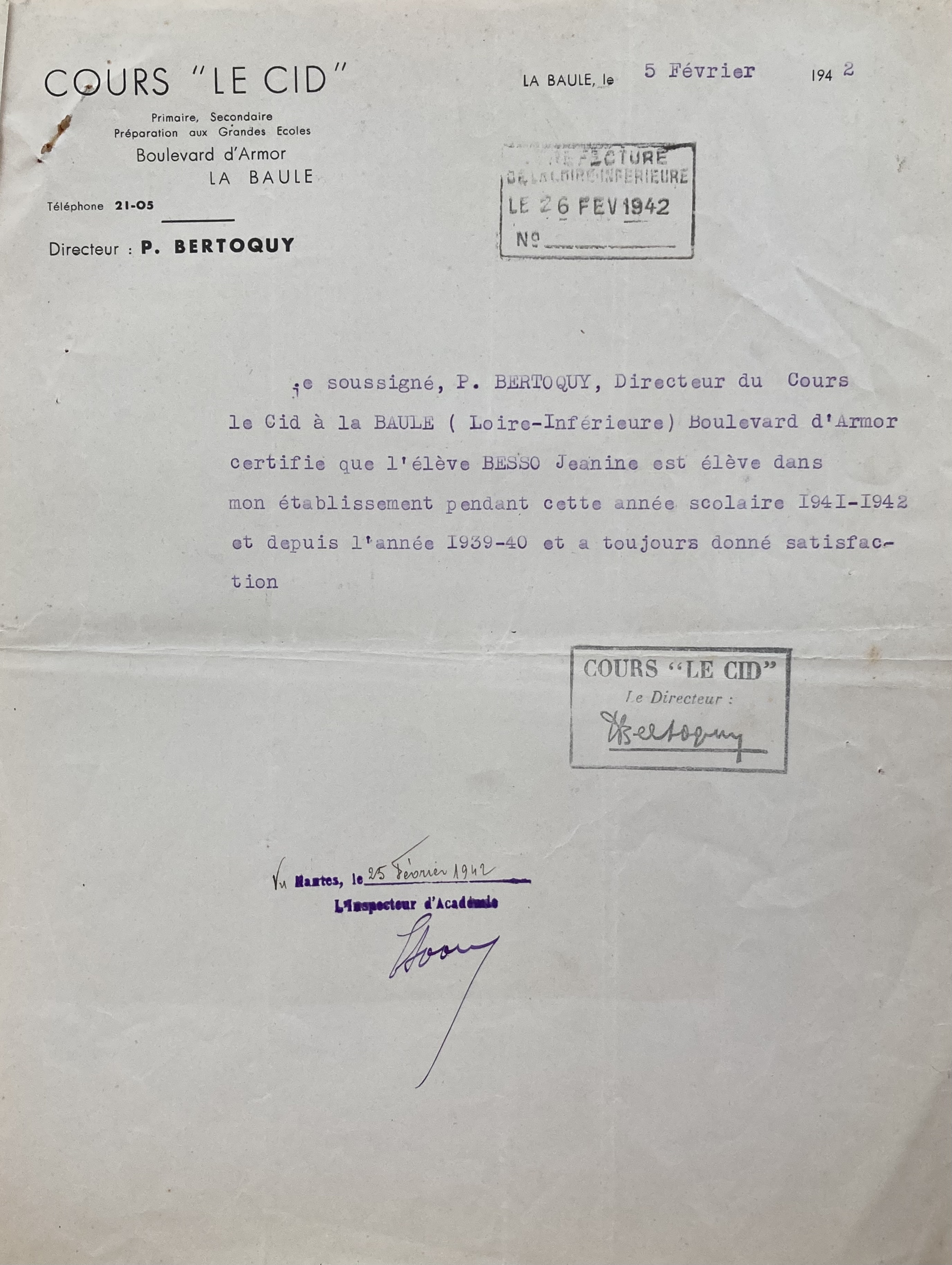Janine BESSO suit sa scolarité au cours « Le Cid » de septembre 1939 jusqu’en juin 1942. Le directeur en est Pierre BERTOQUY.