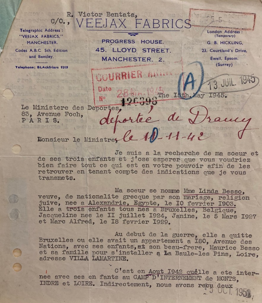 Le frère de Linda, Robert Victor BENTATA [https://farhi.org/wc172/wc172_066.html] qui réside à Manchester, cherche à savoir ce que sont devenus sa soeur et neveu et nièces à la fin de la guerre. Une information lui sera transmise via les fiches de Drancy (verso).