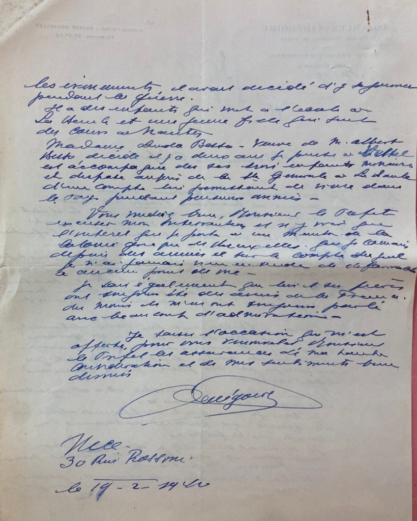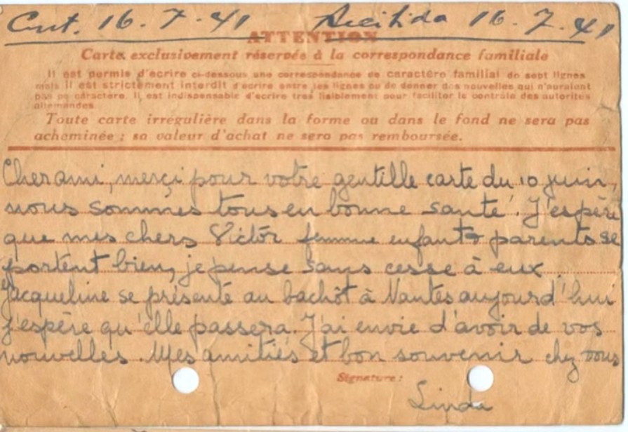 A son arrivée, Linda écrit une lettre à sa famille (à son père Moïse ou à son frère Victor) pour le prévenir de leur arrivée à la Baule et pour les rassurer. La lettre a été écrite avec du papier à en-tête de l’Hôtel Bellevue-Plage situé sur le front de mer.