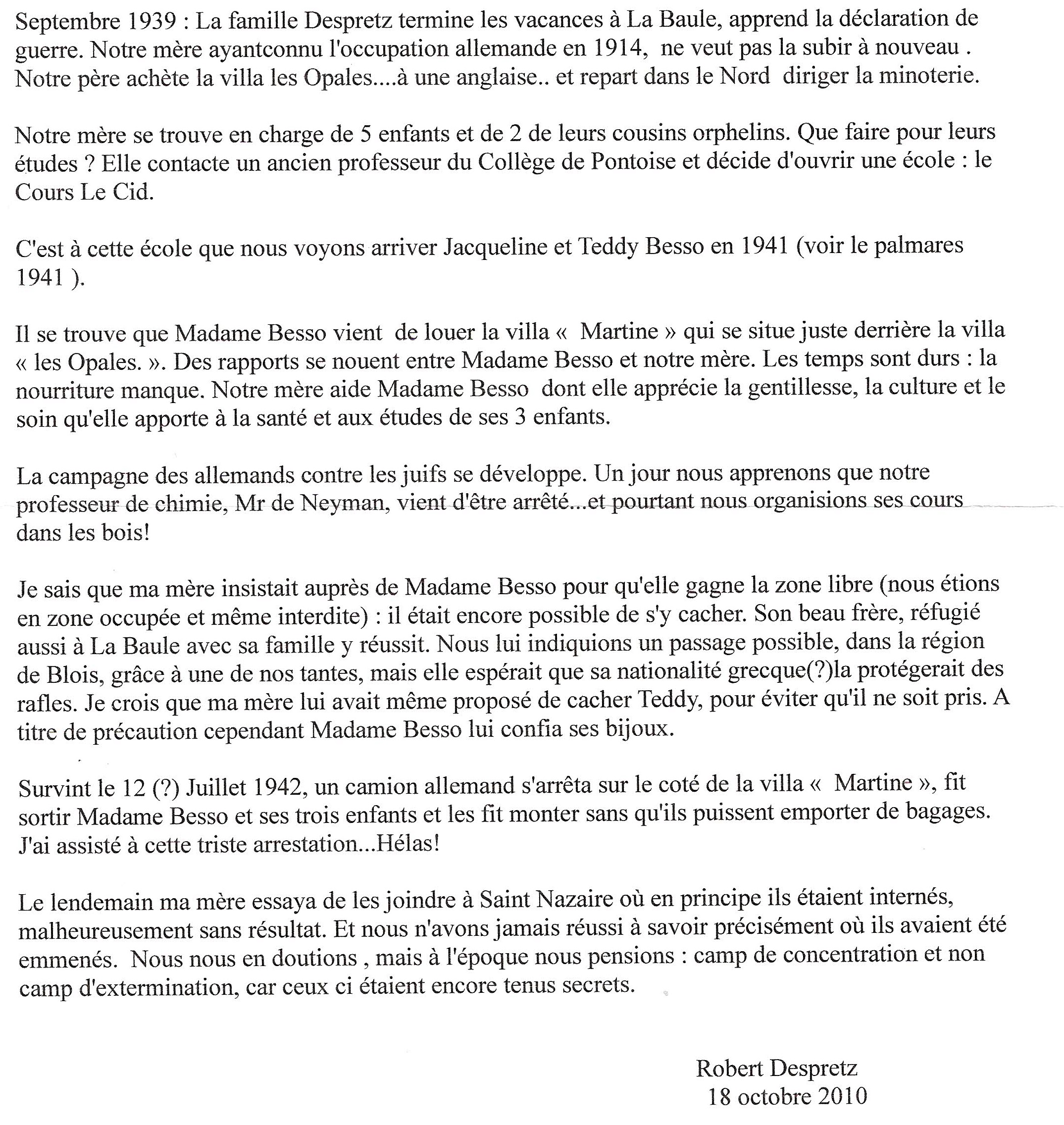 Peu avant l’arrestation, Linda BESSO confie la totalité de ses bijoux à une habitante de La Baule. [Jacqueline et Jack BENTATA, la nièce et neveu de Linda se rendent en France en juin 2010 afin d’identifier cette femme. « Juste après la guerre, une française catholique contacta notre père [Victor Robert BENTATA]. Pressentant sans doute son arrestation, notre tante lui avait remis la totalité de ses bijoux. Cette femme fit le voyage jusqu’à Londres pour les rendre à mon père . Répartis dans notre famille, ils sont les seuls souvenirs qu’il nous reste de notre tante et de ses enfants. « .Jean-Philippe LUCAS (Presse-Océan, 14 juin 2010) poursuit l’entretien : « Leur intention : essayer d’identifier cette française qui aurait pu trouver tellement plus aisé de garder les bijoux pour elle. Nous n’avons aucun nom qui nous permettrait d’identifier cette femme merveilleuse qui eut un tel sens de l’honneur… Pour notre famille, ce serait apporter la dernière pièce à cette histoire tragique« . Cette personne pleine de bienveillance s’appelle Madame DESPRETZ. Décédée en 2010, son fils Robert témoigne le 18 octobre 2010 :