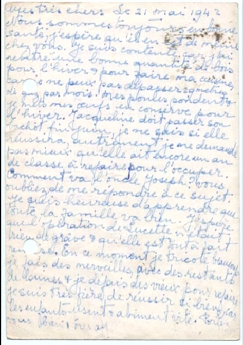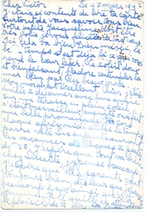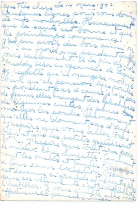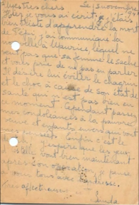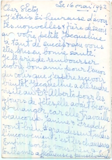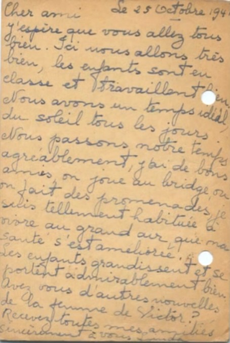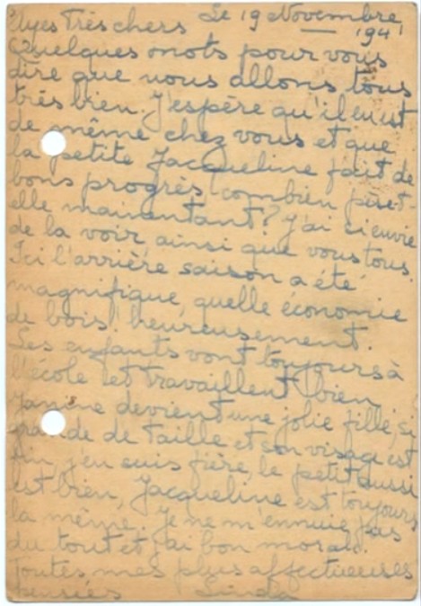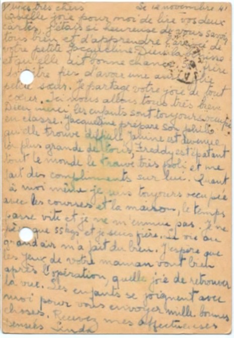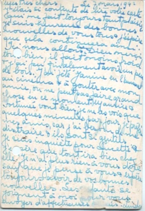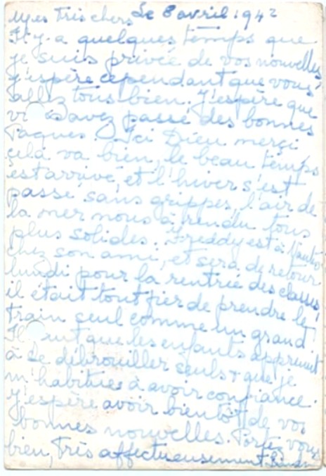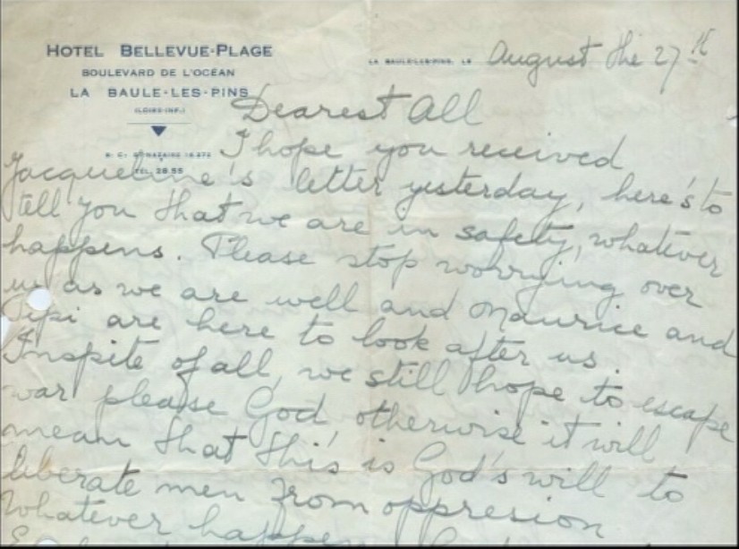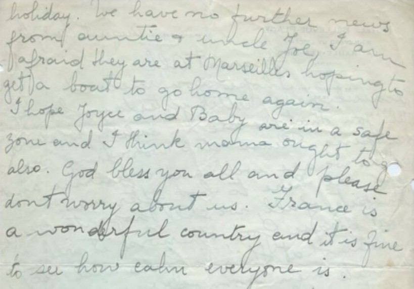 I hope you receveid Jacqueline’s letter yesterday, here’s to tell you that we are in safety, whatever happens. Please stop worrying over us as we are well and Maurice and Pepi are here to look after us.