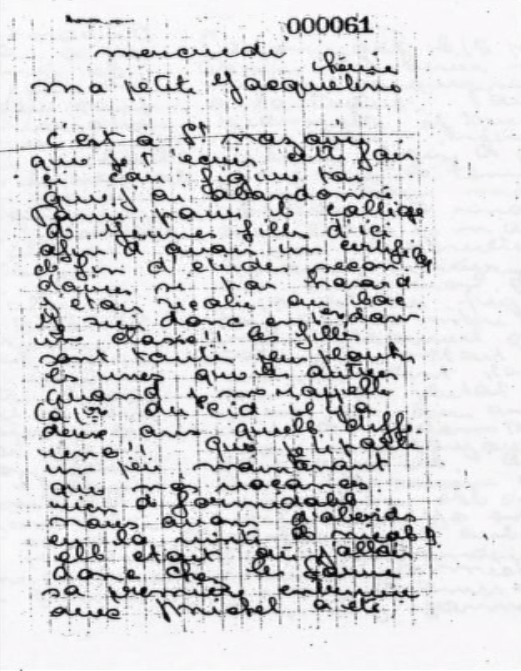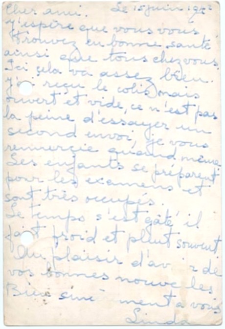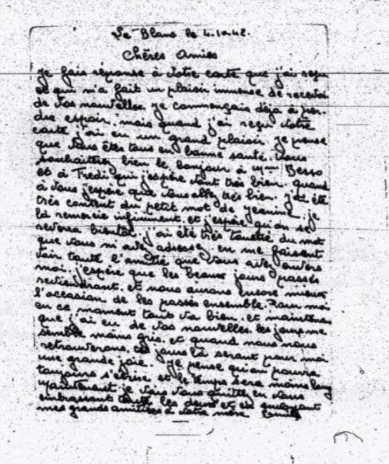 Tu ne peux savoir à quel point ta lettre m’a fait plaisir. Tu ne peux savoir ce que c’est que de savoir que quelqu’un pense à vous. Ici, je m’ennuie terriblement et c’est pourquoi je te demanderai de m’envoyer si tu as un jeu de cartes à toi, je te serai très reconnaissant. Que fais-tu de beau . Vas-tu à la pêche avec Georges ? René est-il de retour ? En tous cas, n’oublie pas de dire à Georges qu’il m’écrive car cela est un réconfort.