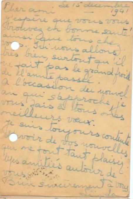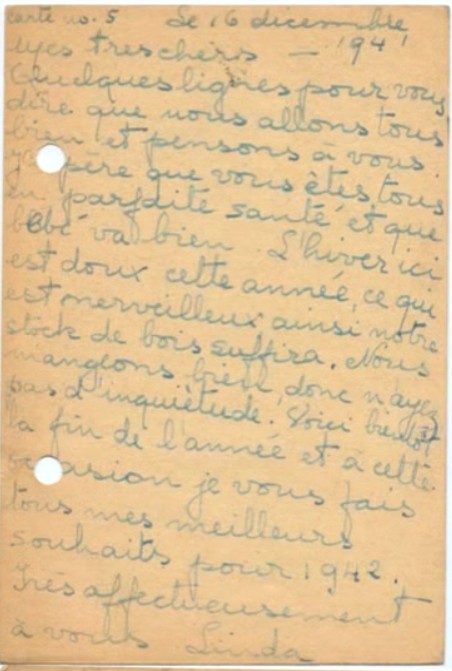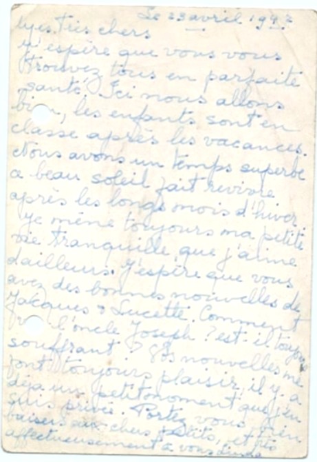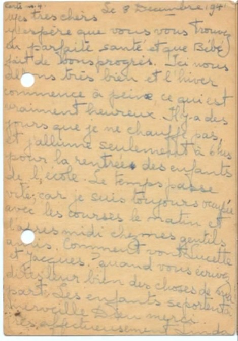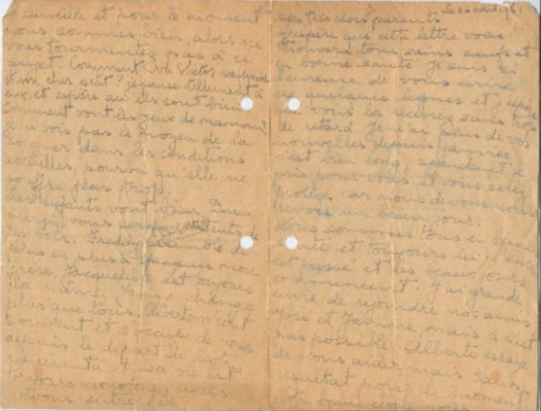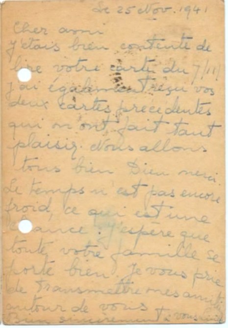 J‘espère que vous avez reçu la lettre de Jacqueline hier, voici pour vous dire que nous sommes en sécurité, quoi qu’il arrive. S’il vous plaît, arrêtez de vous inquiéter pour nous car nous allons bien et Maurice et Pepi sont là pour nous surveiller.
