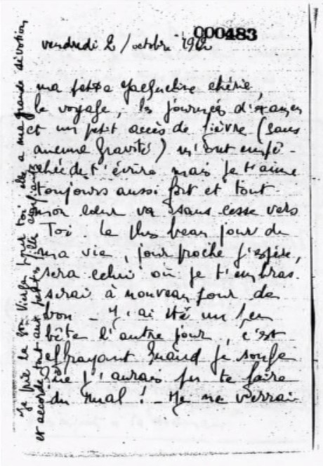 Le voyage, les journées d’examen et un petit accès de fièvre (sans aucune gravité) m’ont empêchée de t’écrire mais je t’aime toujours aussi fort et tout mon cœur va sans cesse vers toi. Le plus beau jour de ma vie, jour proche j’espère, sera celui où je t’embrasserai à nouveau pour de bon. J’ai été un peu bête l’autre jour, c’est effrayant quand je songe que j’aurais pu te faire du mal ! Je ne verrai naturellement ni Mme CLAYSSENS ni Mme NEVEU avant une huitaine, pourvu qu’elles n’aillent pas s’adresser à Michel. Je viens de recevoir une lettre de Gillet qui me parle de toi. Il a rencontré Cri-Cri. Jacques Larue est à La Baule et à « bon espoir » pour son bac. Quant à ta petite Ray, heureusement que tu l’aimes de toute façon parce que je ne suis pas optimiste pour attendre mes résultats. J’ai divagué en latin et en anglais (en thème surtout) et fait juste la question de cours en Maths. Poulet était ici jusqu’à hier. Il est sympa. J’adore tous les gens auxquels je peux parler de ma petite Jacqueline. A propos de Michel, à ta place je n’aimerais pas du tout que tout le monde s’en mêle. Janette et la bande devait savoir avant moi parce que j’ai été la dernière à croire et soutenir que M. [Michel] t’aimait bien malgré certaines apparences. Je disais qu’il était sauvage, renfermé. Enfin, je vais arranger çà au mieux et tâcher de leur faire admettre que M. [Michel] ne t’a pas tellement laissé choir. Dès mon retour à La B. [la Baule], je vais le voir lui-même et te donner mon opinion précise. Même, je vais lui écrire demain pour que ça aille plus vite, par lettre, j’oserai davantage. Ne crains rien, je prends tes intérêts trop à cœur pour commettre la moindre faute de tact et je sais combien M. [Michel] est sensible, vite vexé.
