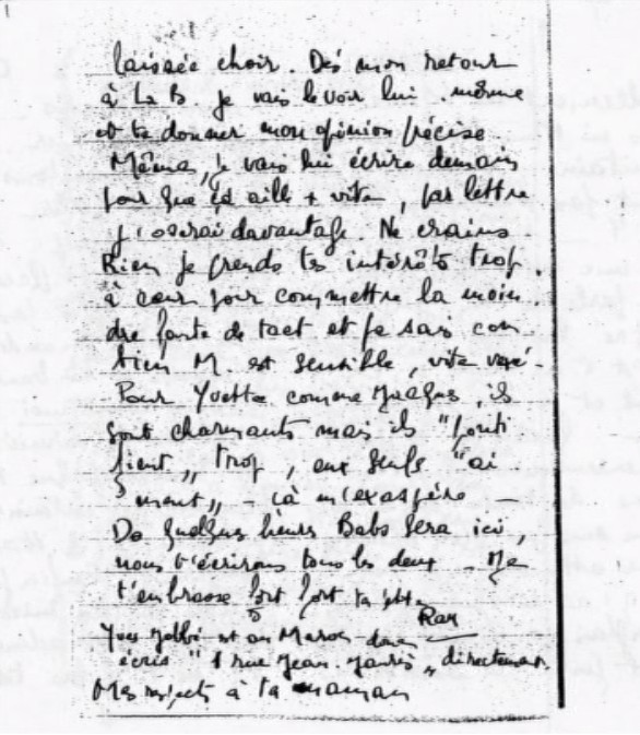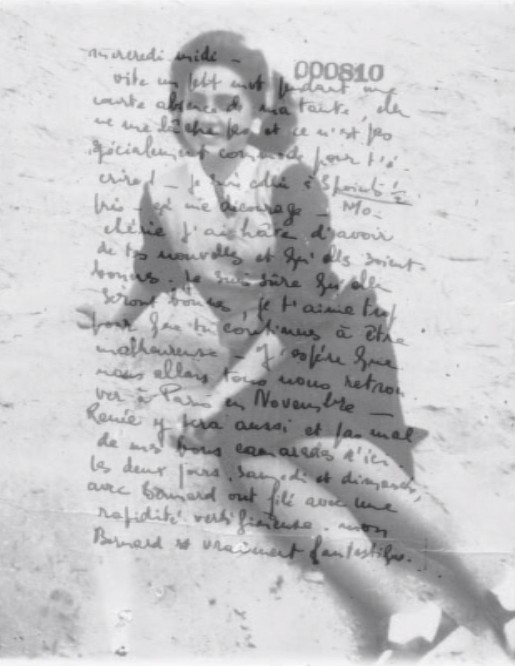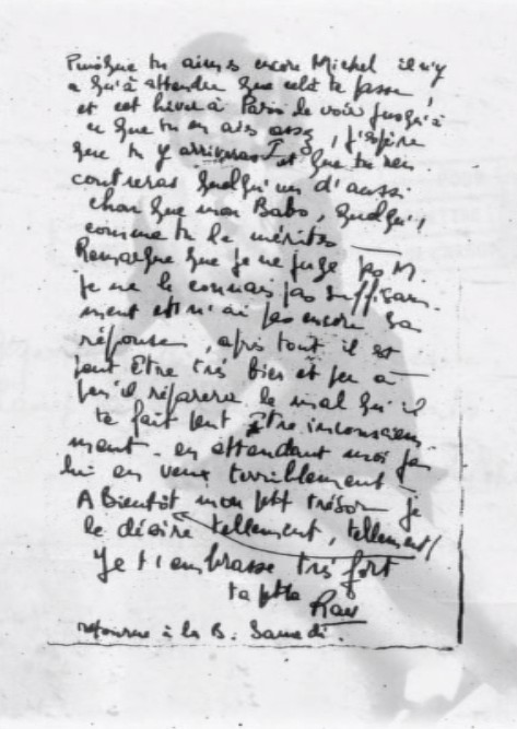 Les deux jours, samedi et dimanche, avec Bernard ont filé à une rapidité vertigineuse. [illisible] Bernard est vraiment fantastique. Puisque tu aimes encore, il n’y a qu’à attendre que cela te passe et cet hiver à paris le voir jusqu’à ce que tu en aies assez. J’espère que tu y arriveras et que tu rencontreras quelqu’un d’aussi charmant que mon Babo, quelqu’un comme tu le mérites.