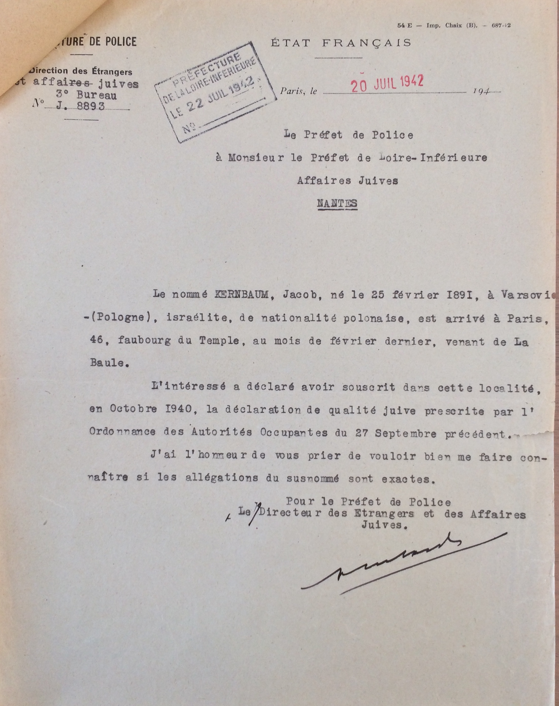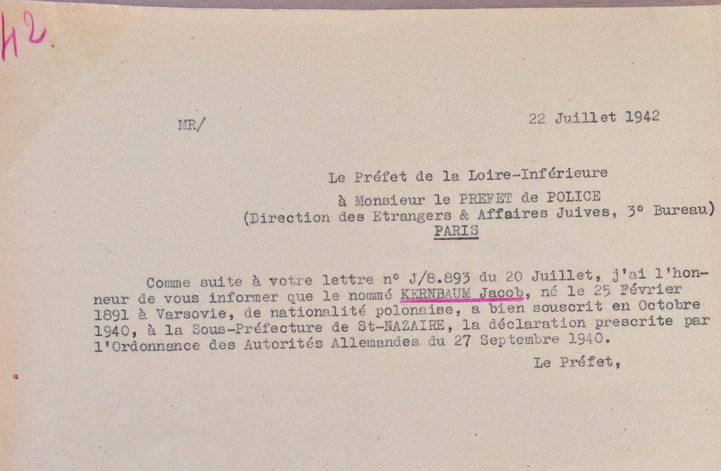Le 20 juillet 1942 (soit deux jours après la rafle dite du Vel d’Hiv), une enquête est diligentée auprès de la Préfecture de Loire-Inférieure par la Direction des Etrangers et des Affaires Juives de la Préfecture de Police de Paris pour savoir si Jacob KERNBAUM a bien été se faire recenser.