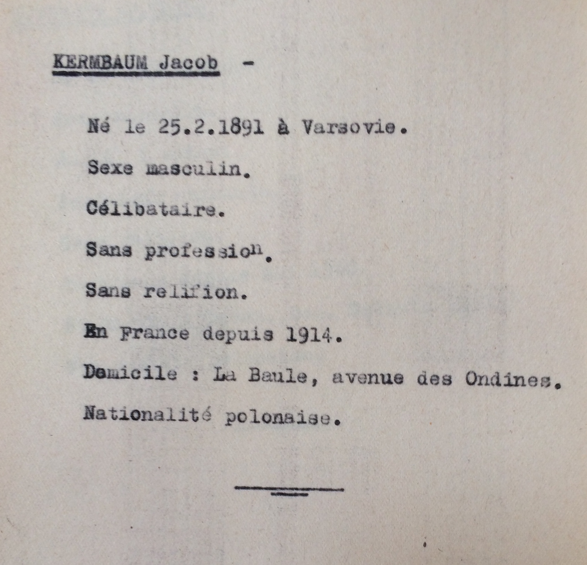 Arrivé en France en 1914, Jacob (prénom usuelJacques) KERNBAUM est né le 25 février 1891 à Varsovie et est de nationalité polonaise. Il est célibataire. [Père : Isaac et Mère : CHESTCELSKA ou CHARKESKA Agatsther]