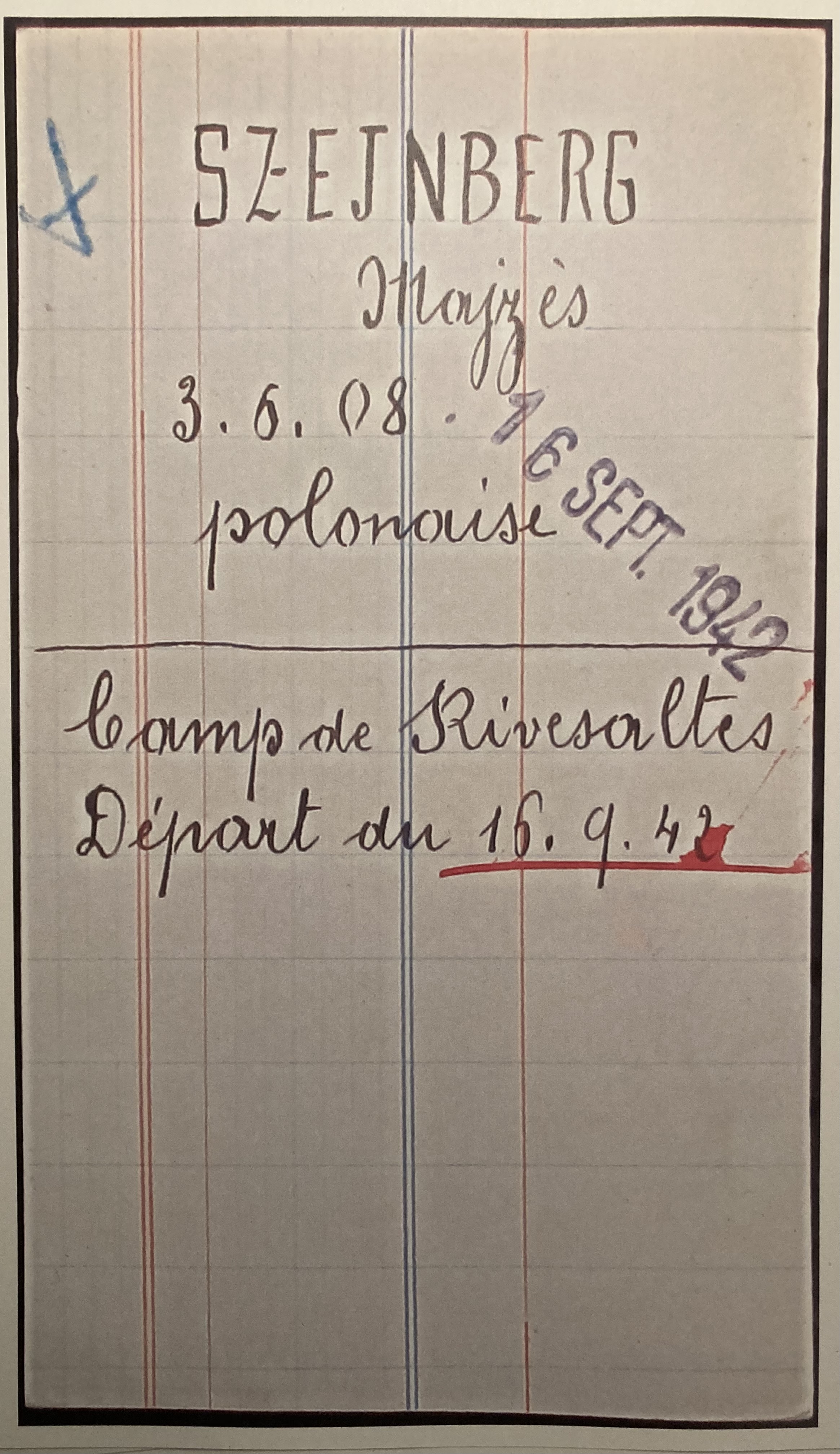 Mojzesz SZEJNBERG a quitté la commune pour une destination inconnue (sans date) et passe la ligne de démarcation. Il est arrêté et interné au camp de Rivelsates puis transféré au camp de Drancy d’où il est déporté par le convoi numéro 33 le 16 septembre 1942 de Drancy à Auschwitz.