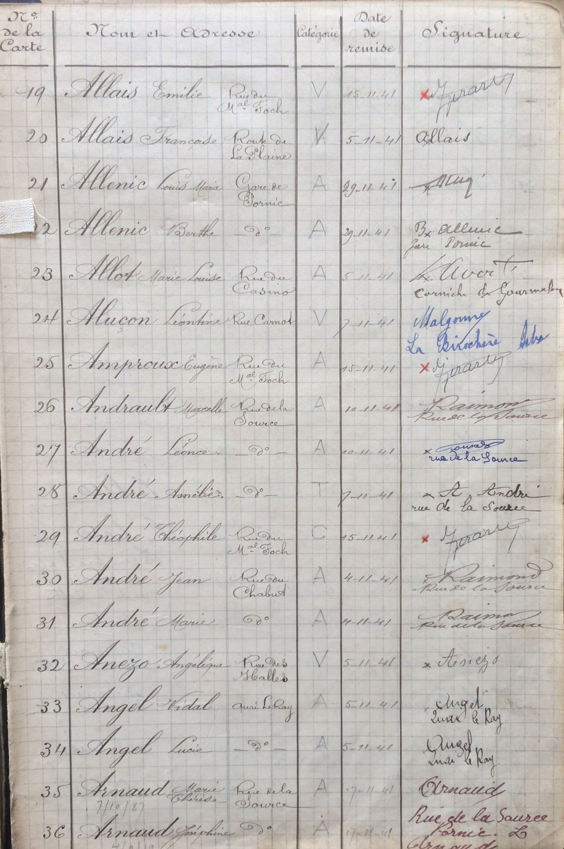 A l’automne 1940 puis en décembre 1942, le tampon juif est apposé sur les cartes d’identité et cartes d’alimentation. Vidal ANGEL est venu récupérer la sienne le 05 novembre 1941.