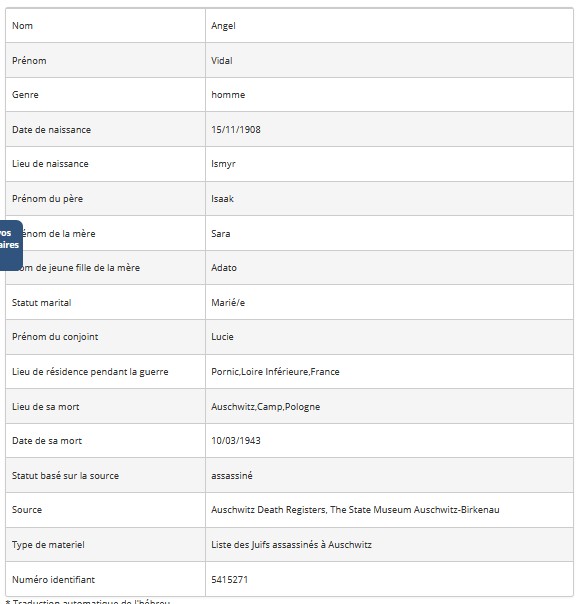 Vidal ANGEL n’a pas été déporté par le convoi numéro 8 d’Angers à Auschwitz. Le convoi numéro 8 est un convoi particulier dans lequel est censé se trouver uniquement des personnes en âge de travailler. Les enfants (accompagnés du père ou de la mère ou du grand-père ou de la grand-mère) sont dirigés vers le camp de La lande à Monts près de Tours ainsi que les personnes de plus de 55 ans. Par ailleurs, 14 hommes et 15 femmes sont rayés de la liste du convoi pour être déposés à Drancy. Les raisons de cet arrêt restent à ce jour inconnues. Comme le souligne Serge Klarsfeld, il peut s’agir d’un arrêt du à un problème de nationalité et par ailleurs, ces 29 personnes sont pour la plupart très âgées. Vidal s’est arrêté à Drancy (peut-être du à son grave problème d’oeil du à sa blessure de septembre 1939) et a été enregistré dans le camp de Drancy sous le numéro matricule 26020.