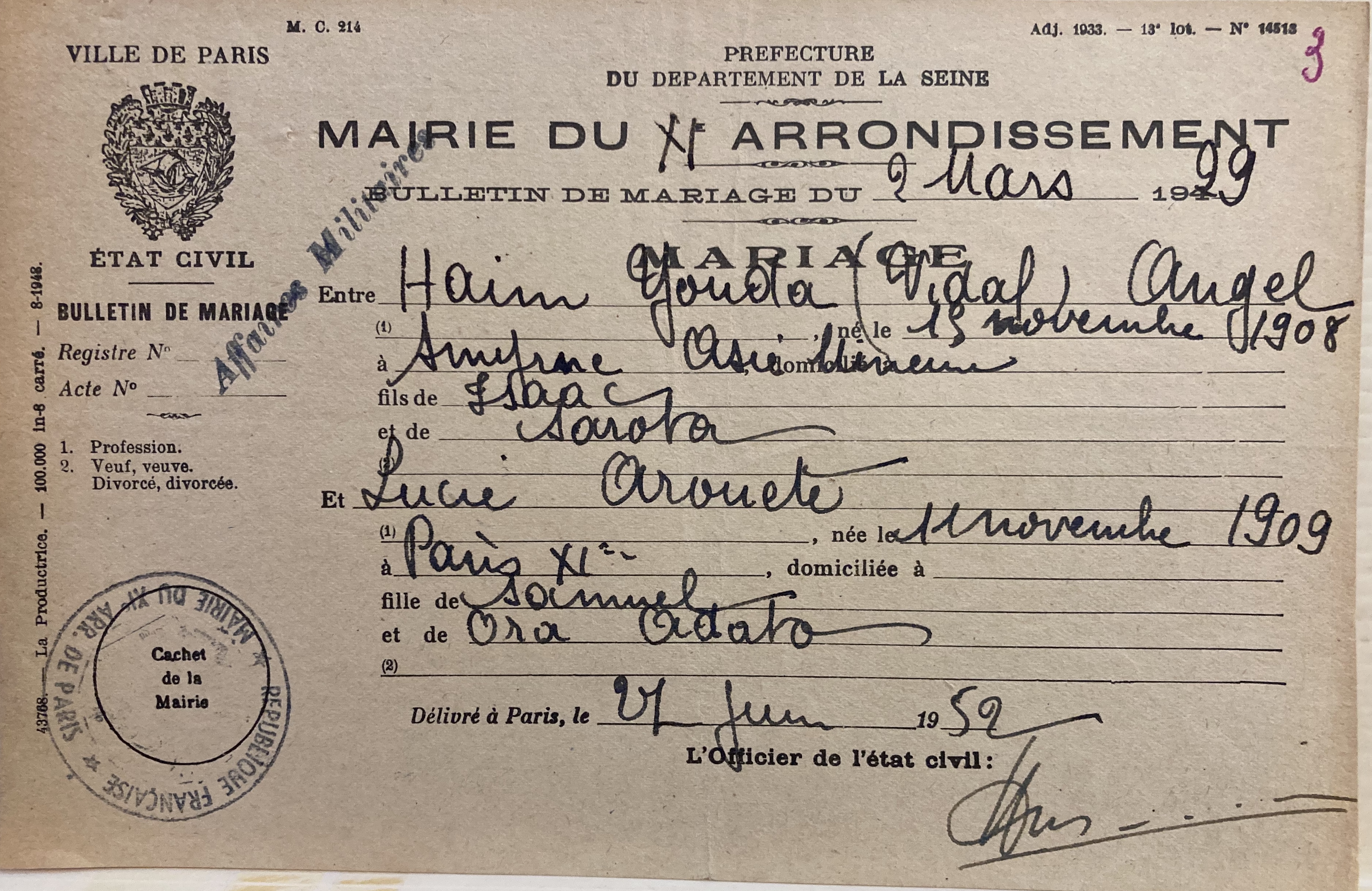 Le 02 mars 1929 [Paris, 11ème arrondissement], il se marie avec Lucie AROUETE (prononcé Arouété) [Père : AROUETE Samuel, commerçant et Mère : Ora (ou Oro) ADATO] née le 11 novembre 1909 à Paris (11ème arrondissement), Vidal a alors vingt ans et Lucie 19 ans. Juste après leur mariage et jusqu’en 1936, le couple qui n’aura pas d’enfant va être domicilié au 53, rue Sedaine à Paris (11ème].