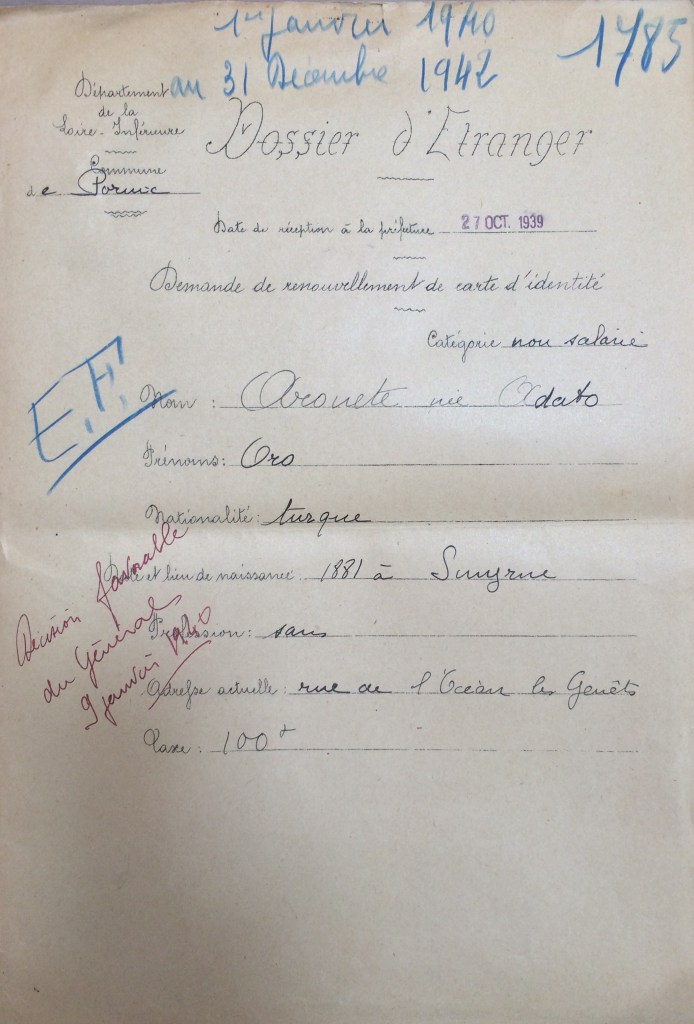 Oro arrive à Pornic le 04 septembre 1939 et réside alors rue Pasteur Villa Philadelphia. Son mari Samuel n’est pas présent puisqu’ engagé sous les drapeaux depuis le 1er septembre 1939. Les deux époux sont présents en octobre 1939 (démobilisation de Samuel ?) et ils effectuent les 21 et 24 octobre 1939 une demande de renouvellement de cartes d’identité auprès de la mairie de Pornic. Il est probable que toutes les familles se réunissent ensemble à Pornic (familles Salomon ANGEL, Vidal ANGEL et Sarah AROUETE). Oro et Samuel ont déménagé de la Villa Philadelphia vers la Villa Les Genêts à Gourmalon en octobre 1939 où ils habitent avec Sarah ANGEL.