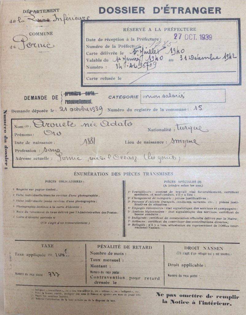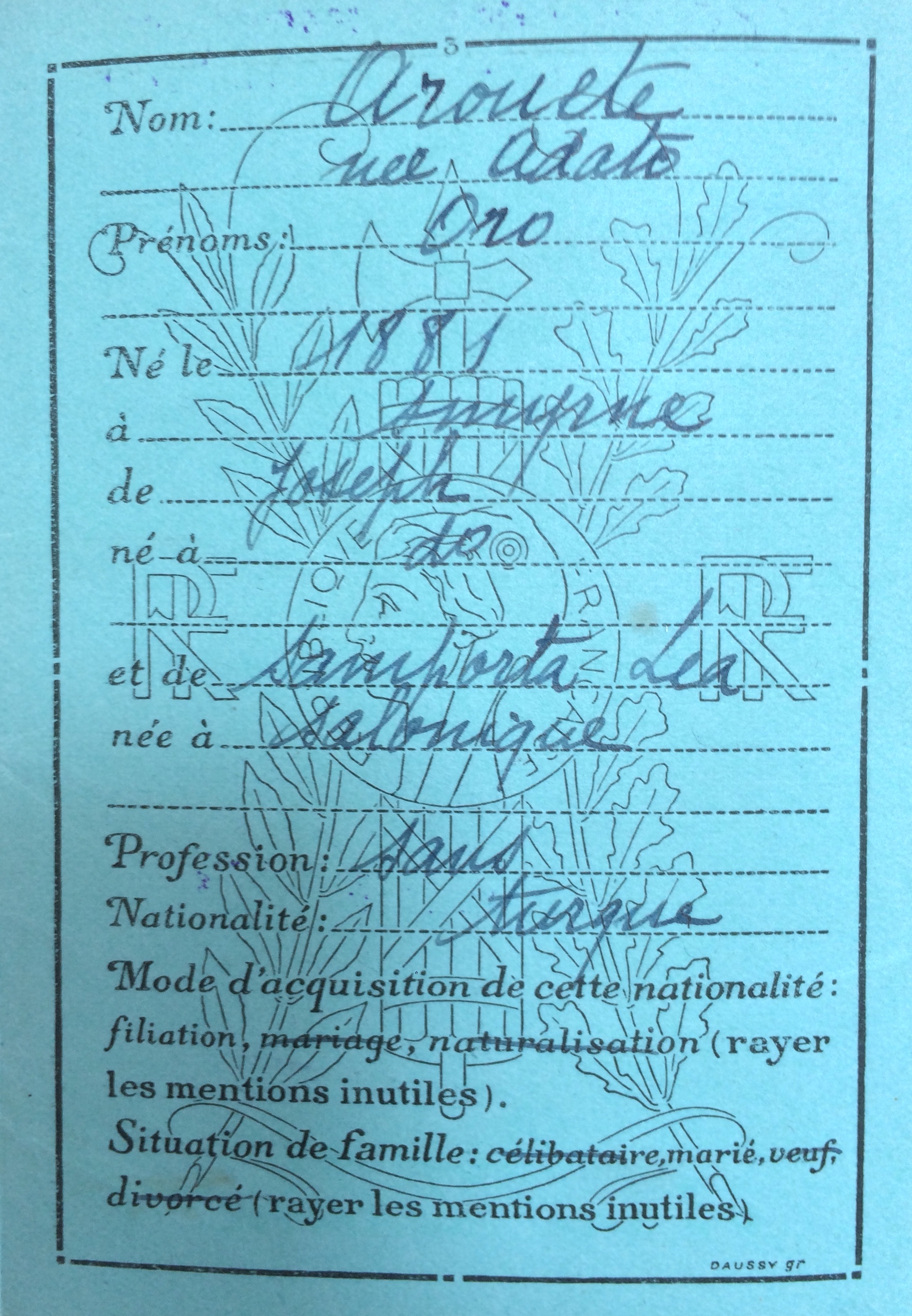 Oro (ou Ora) AROUETE née ADATO est née à Smyrne en 1881 et est mariée avec Samuel AROUETE né le 04 janvier 1885 dans la même ville. Samuel et Oro sont les parents de Lucie ANGEL et Oro est la soeur de Sarah AROUETE épouse ANGEL. Ils se sont mariés le 03 août 1920 à Paris (11ème arrondissement) où ils résident au 63, rue Sedaine et au moins jusqu’en 1940. Le couple a par ailleurs deux autres enfants : Léon né le 16 mai 1907 et Vidal né en 1912.