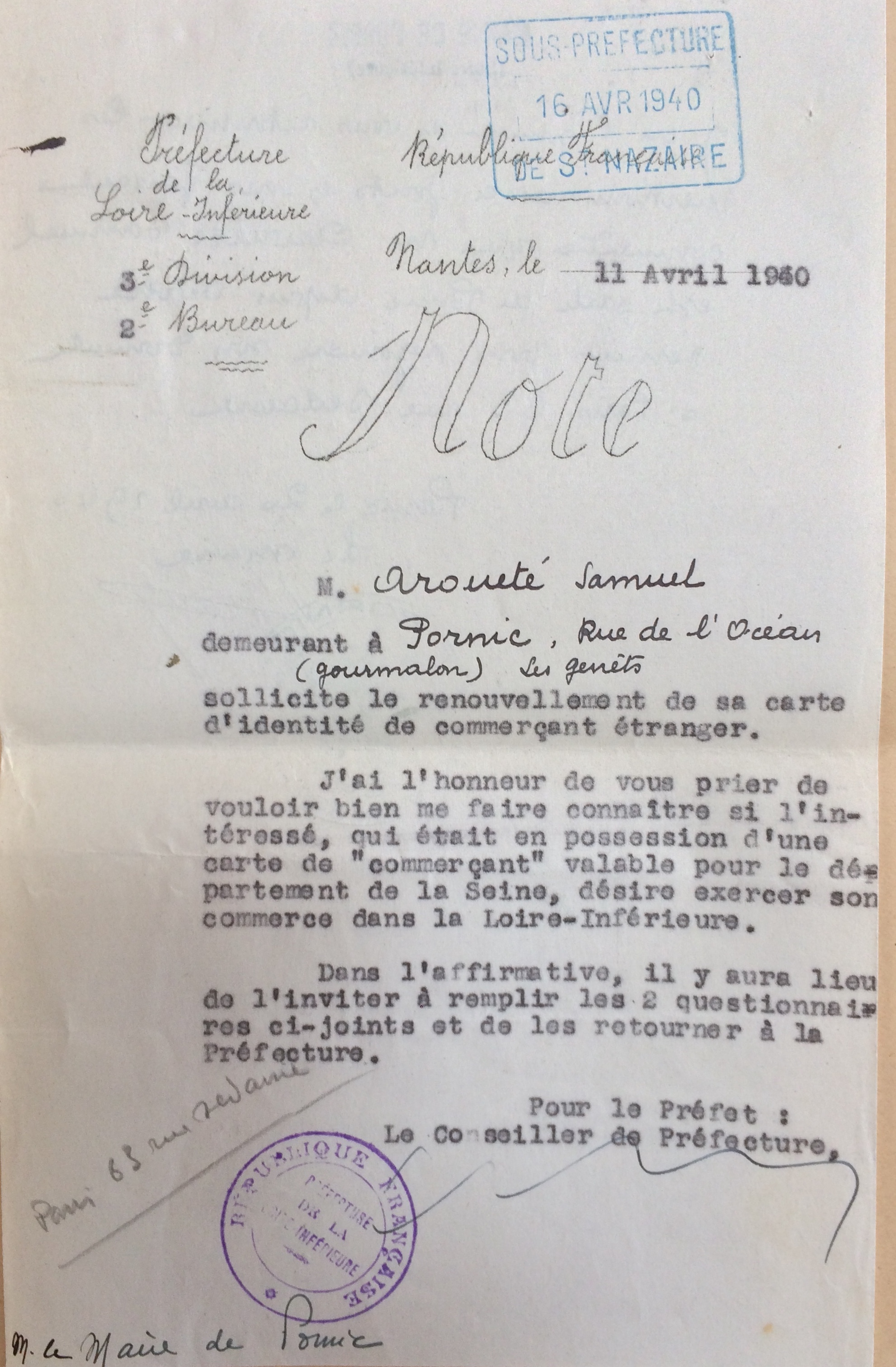 Le 08 octobre 1940, elle se fait recenser auprès des services de la Préfecture de Loire-Inférieure en tant que Juif sous le numéro 9. Elle a déménagé de Gourmalon pour loger chez sa fille et son gendre quai Leray à Pornic.
