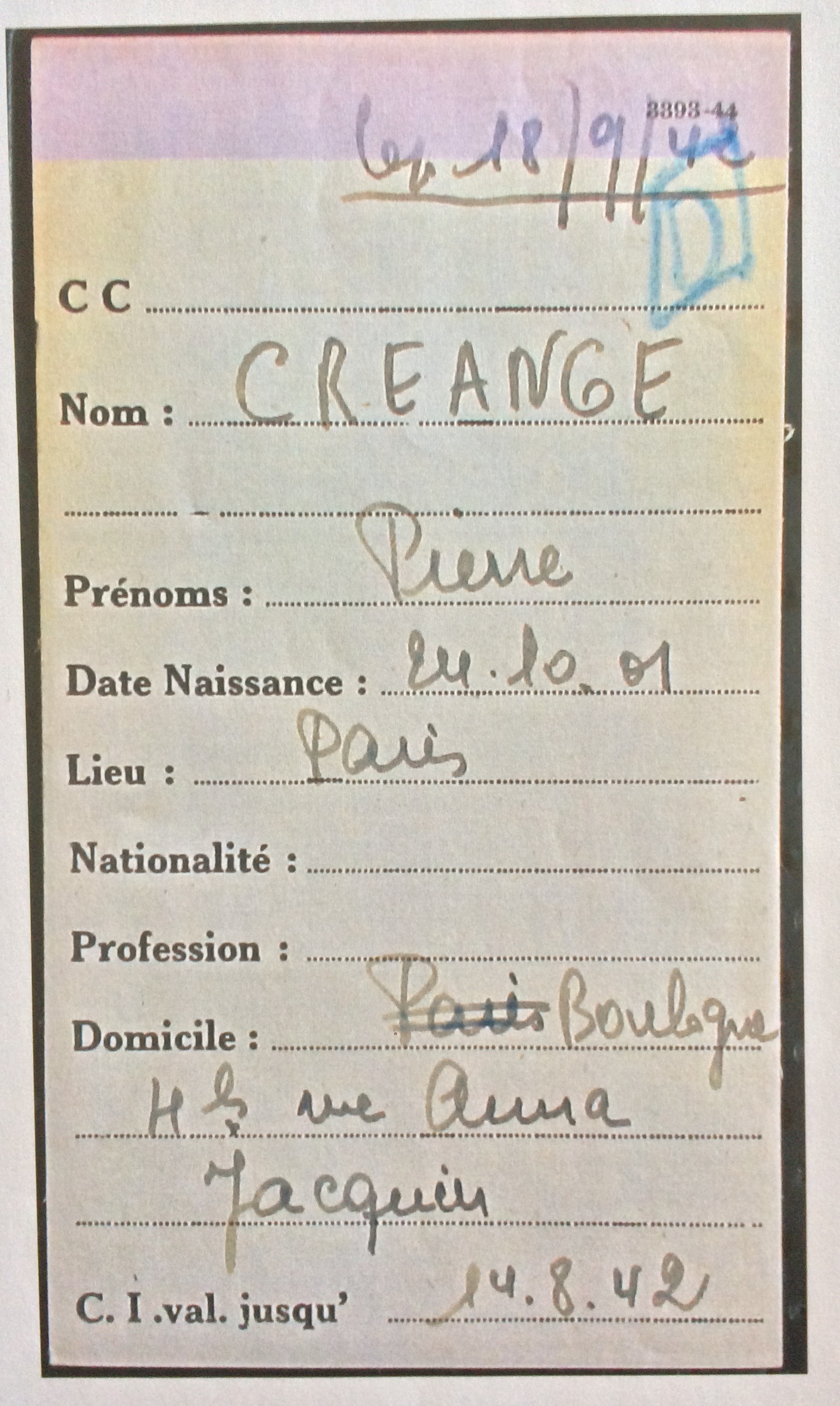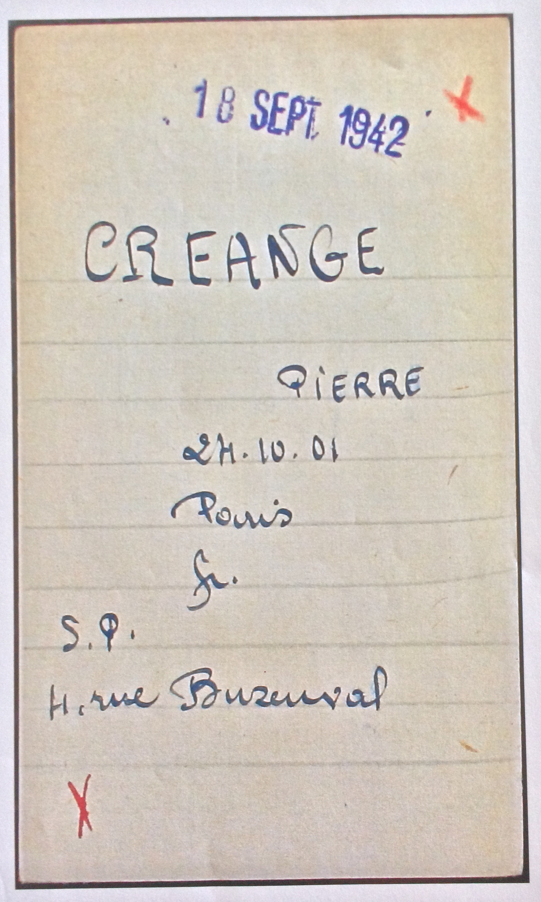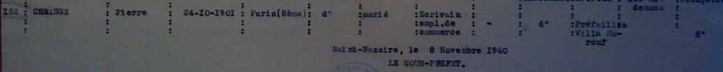 Entre le 27 septembre et le 20 octobre 1940, Pierre CREANGE se déclare en tant que Juif auprès de la sous-préfecture de Saint-Nazaire sous le numéro 152. Il est le dernier à le faire. Il réside alors Villa Marouf à Préfailles au 4, rue Joseph Laraison.