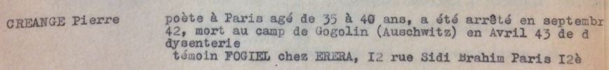 La documentation réunie au Ministère des Anciens Combattants et Victimes de Guerre pour renseigner les familles après guerre dont une partie consacrée au Camp d’Auschwitz précise les circonstances du décès de Pierre CREANGE : décédé au Camp de Gogolin [sous-camp d’Auschwitz] en Avril 1943 de dysenterie.