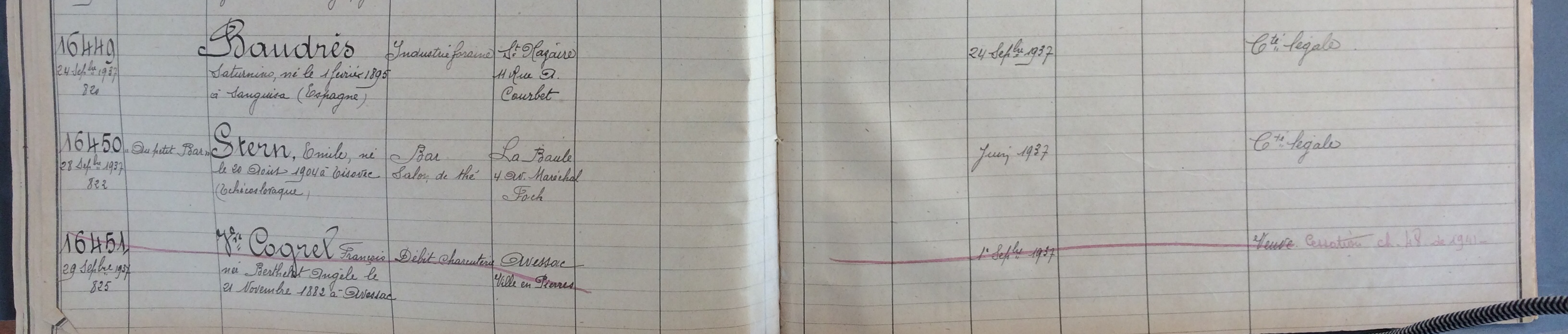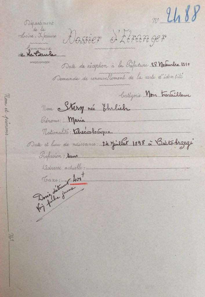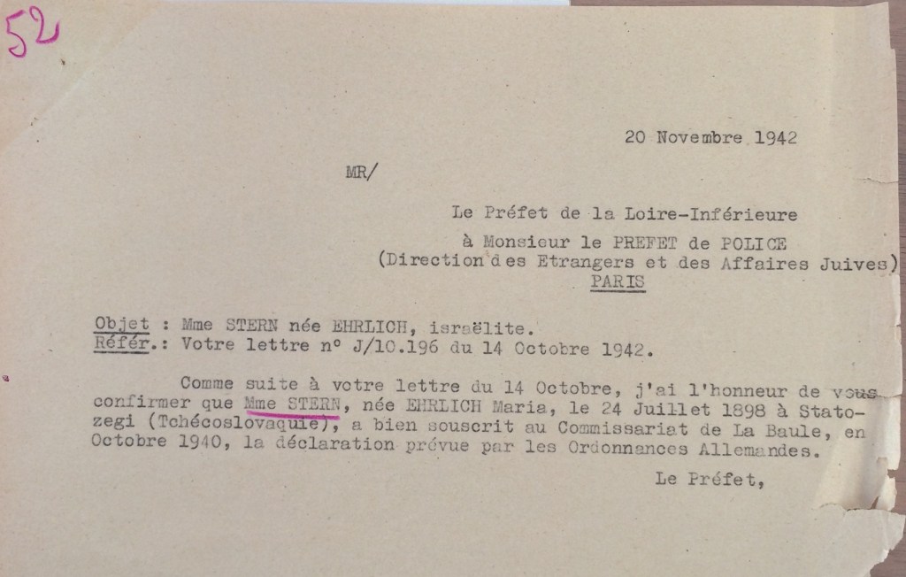 Maria STERN, toujours présente en septembre/octobre 1940 sur La Baule ne se déplace pas à la sous-préfecture de Saint-Nazaire mais se déplace à la mairie de la Baule qui l’enregistre en tant que Juif conformément à la deuxième ordonnance allemande obligeant les Juifs français ou étrangers au recensement.