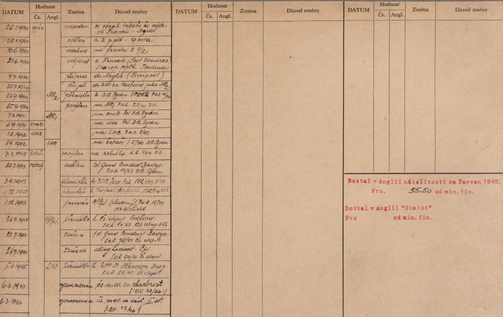 Il part combattre l’armée allemande le 10 juin 1940 puis se rend à Port Vendres (Pyrénées Orientales) pour rejoindre l’Angleterre par Liverpool le 07 juillet de la même année. Il est incorporé dans le 312ème escadron de la RAF essentiellement composé de pilotes tchécoslovaques puis rejoint un peu plus tard la base aérienne de Airfield et est incorporé au quartier général du 134ème Squadron à Airfield (Ecosse). Il est démobilisé en 1946. Il rentrera en 1975 au StB (Státní Bezpečnost), service de sécurité et de renseignements tchècoslovaque [Source : https://stbezo.info/s195.htm].