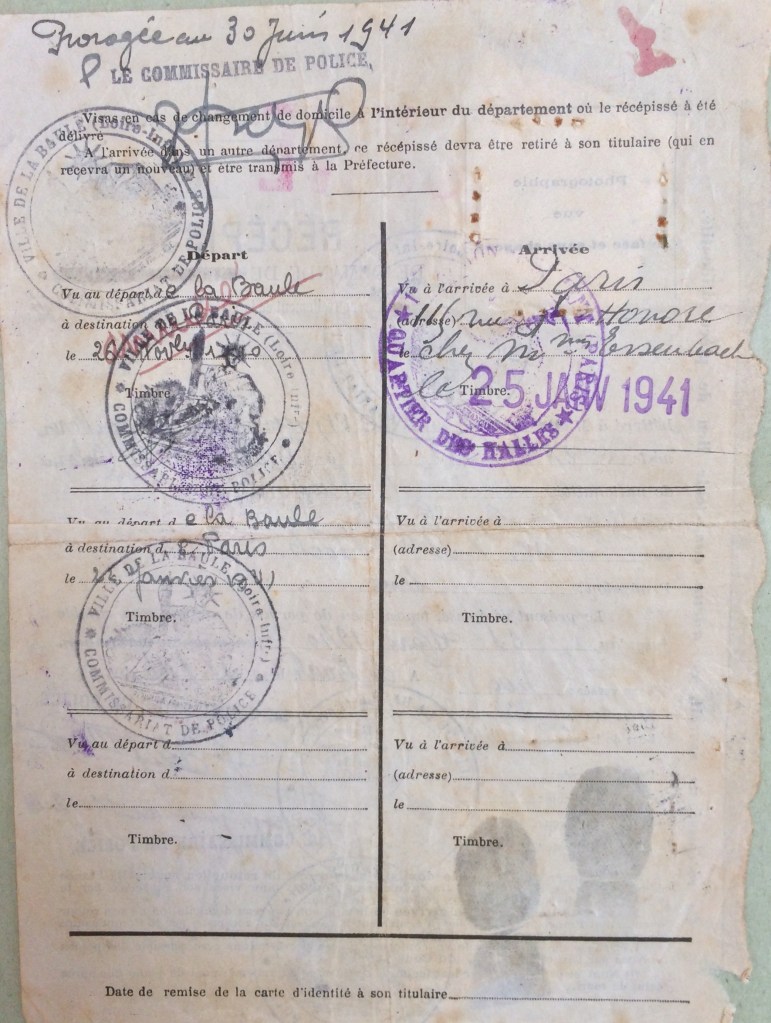 Elle effectuera une demande de renouvellement de carte d’identité en novembre 1939 et le tampon « Juive » sera apposé sur son récépissé à l’automne 1940.