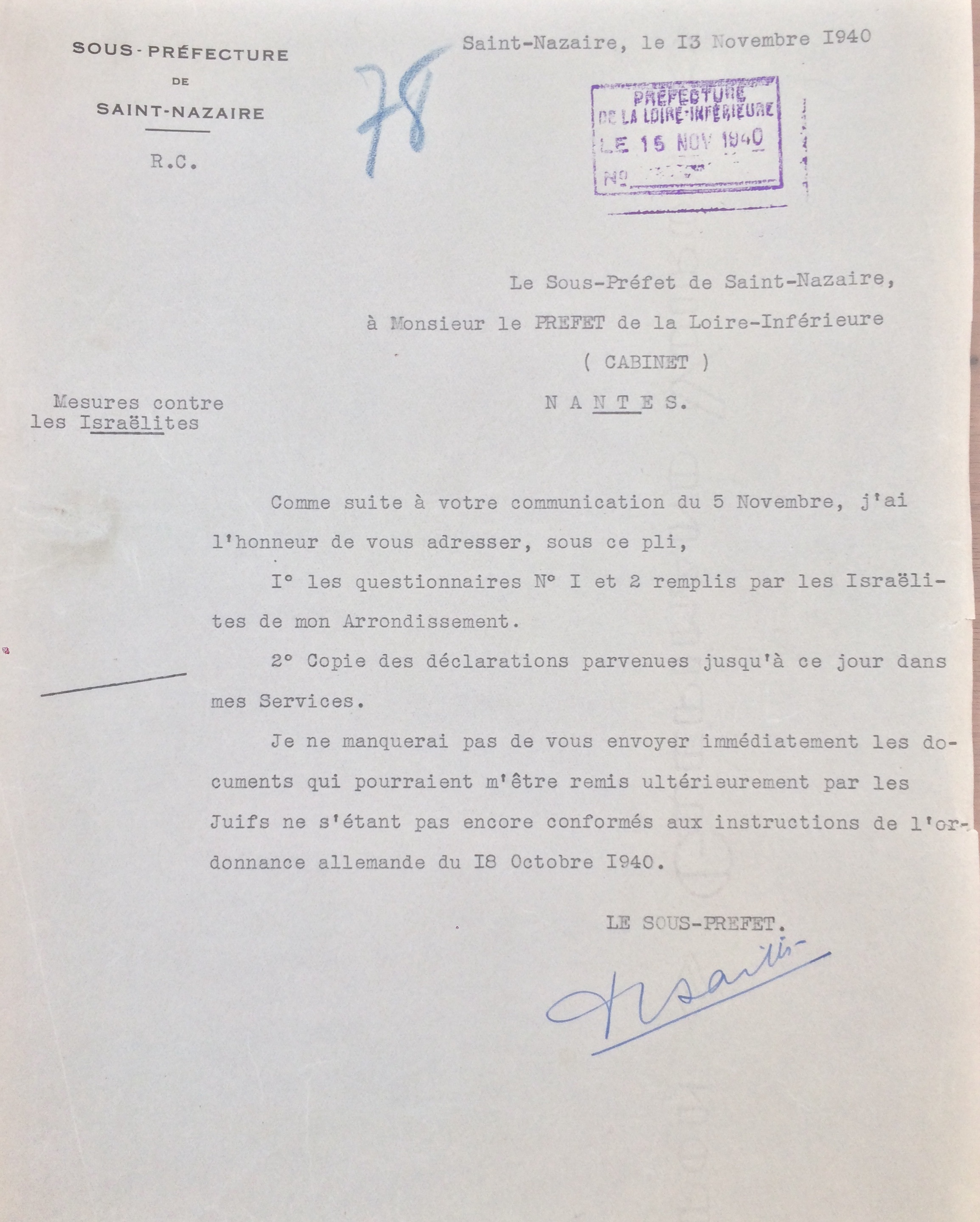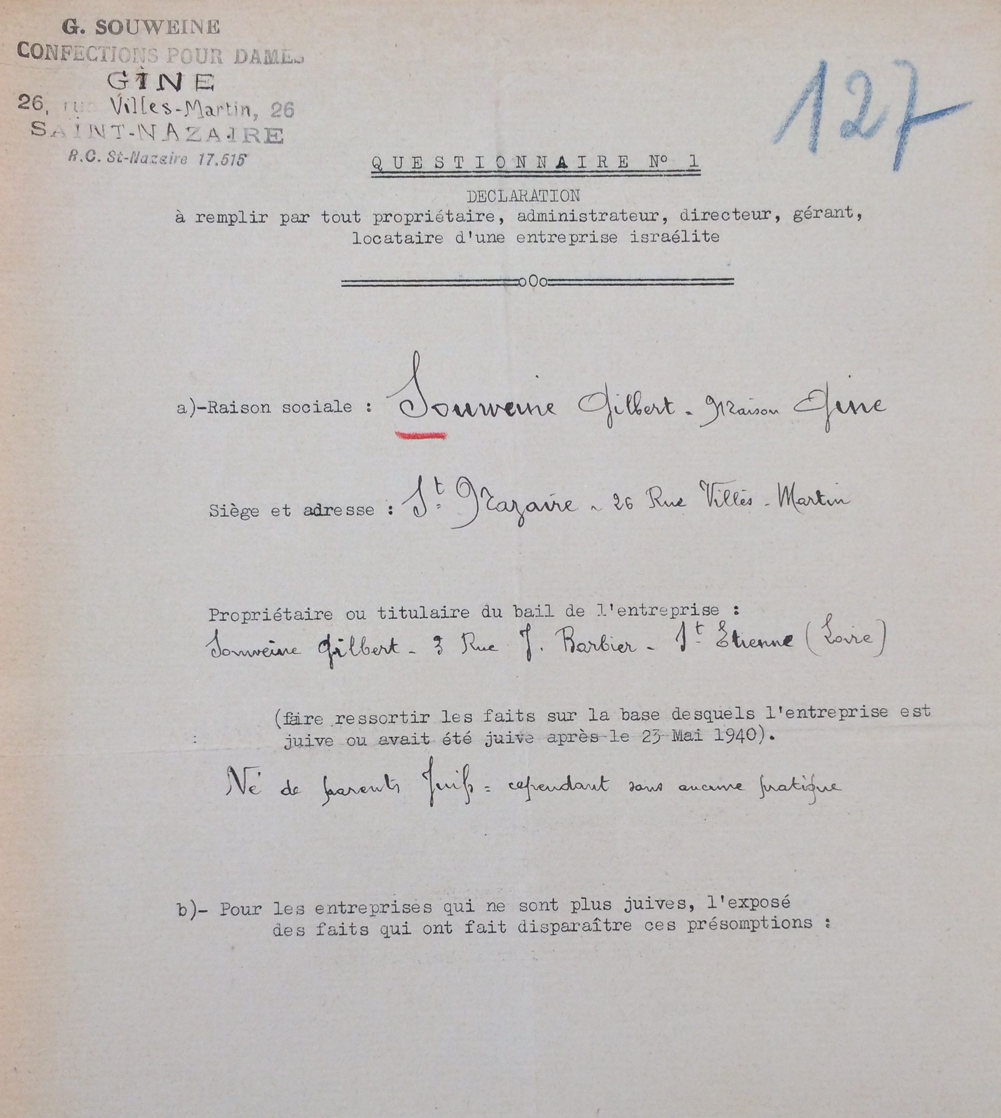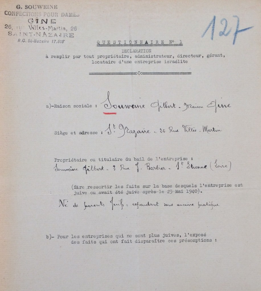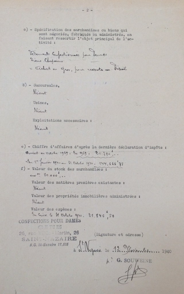 En revanche, et conformément à la deuxième ordonnance allemande du 18 octobre 1940, il déclare son entreprise comme juive auprès de la sous-préfecture de Saint-Nazaire le 12 novembre 1940.