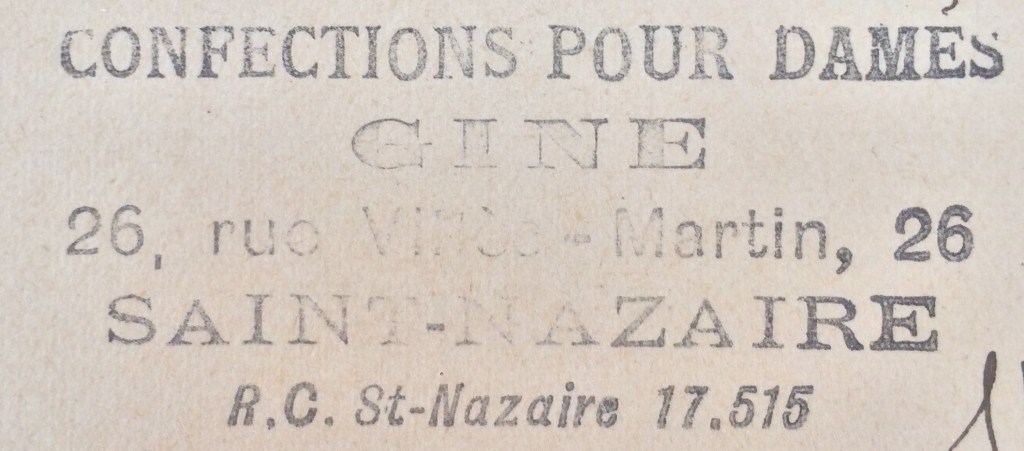 Le 17 septembre 1939, pour subvenir aux besoins de sa famille, il s’inscrit au registre de commerce de Saint-Nazaire et rachète un magasin de nouveautés « Au Sans Pareil » à Monsieur Ovide NESTI et installe un commerce de confections pour dames, le magasin « Gine » [Début des lettres de son prénom et fin des lettres du prénom de son épouse] au 26, rue Villes-Martin à Saint-Nazaire.